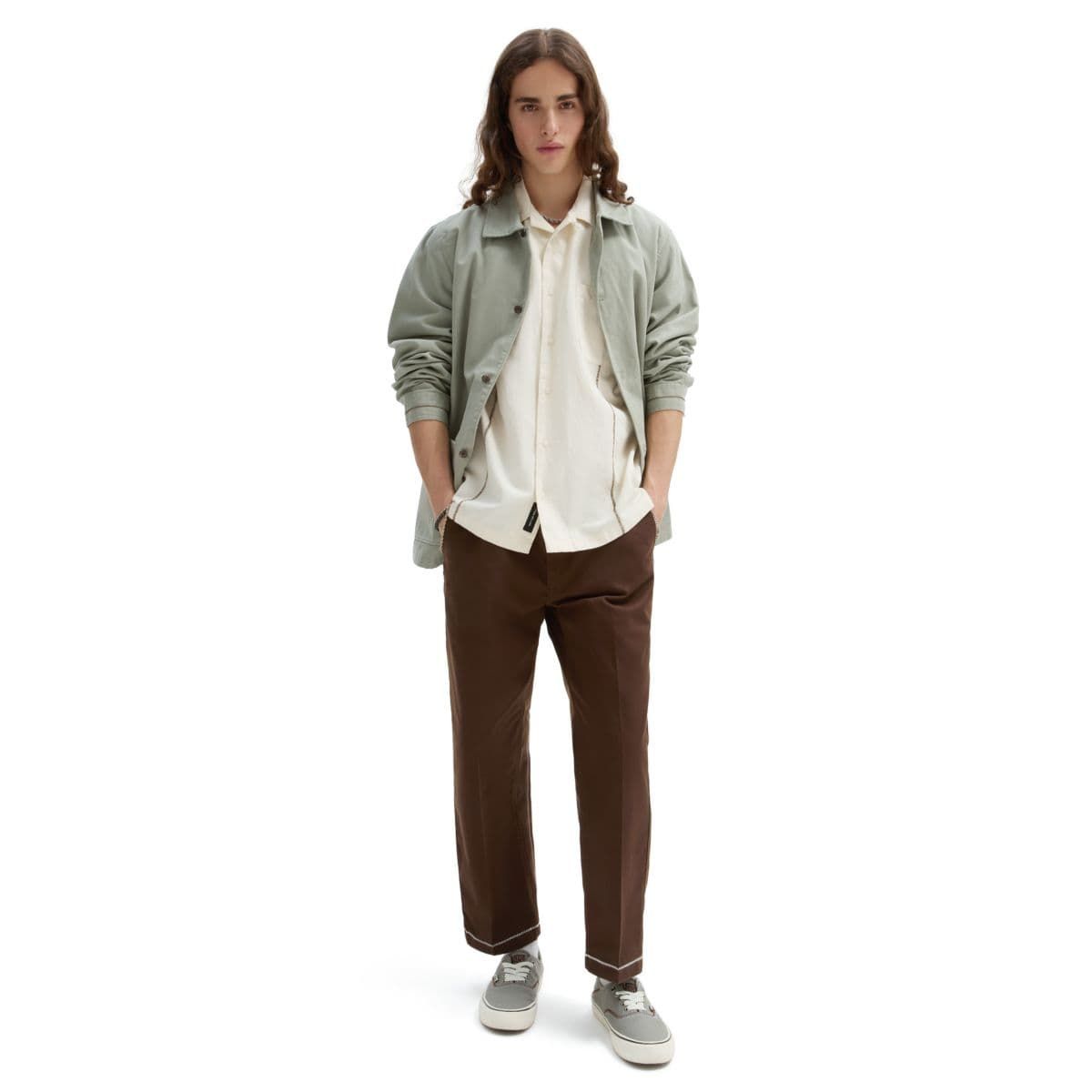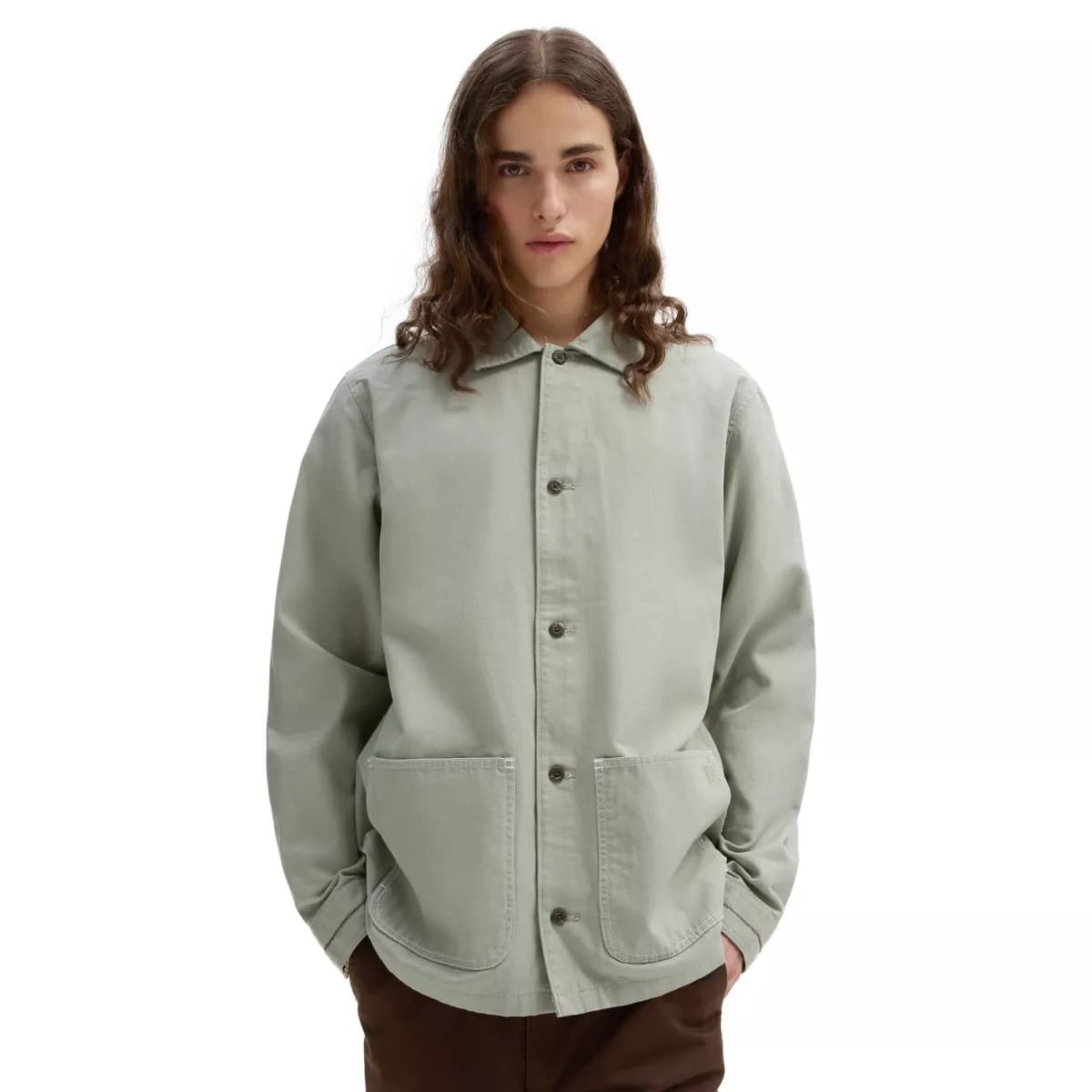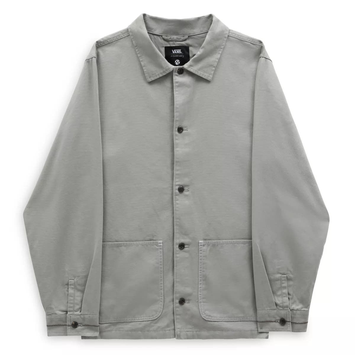 La chaqueta Mikey February gris para hombre cuenta con el diseño clásico del abrigo Drill Chore de Vans, cierre frontal de botones, puños ajustables con botones, bolsillos de plastrón y una etiqueta de garantía Vans VR3 Checkerboard Globe tejida en el interior.