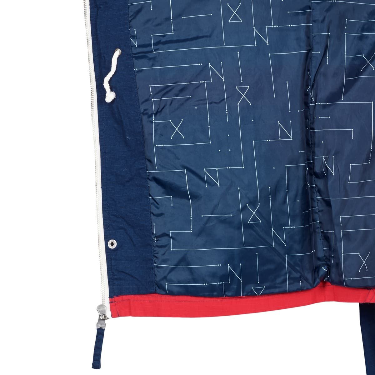 La chaqueta de invierno Pi Jacket azul marino y roja para hombre tiene una etiqueta de garantía Nixon en el interior.