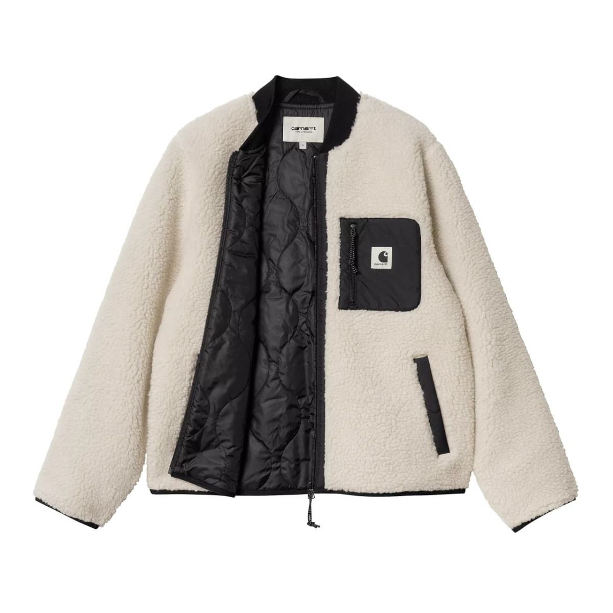 Este forro polar tipo chaqueta cuenta con cálido y suave borreguillo y forro interior enguatado, cierre frontal de cremallera , detalles en contraste de tafetán de nailon, bolsillos laterales, un bolsillo con cremallera en el pecho, junto con una etiqueta de Carhartt tejida en el bolsillo del pecho.