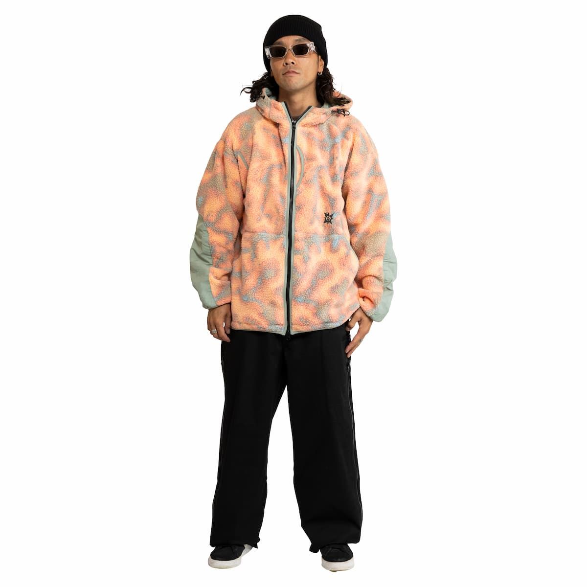 Esta sudadera con cremallera tipo chaqueta, diseñada en colaboración con Bryan Iguchi, cuenta con cálido y suave borreguillo, capucha ajustable, corte clásico, cierre frontal de cremallera Vislon®, cuello medio alto para mayor protección frente al frío, bolsillo delanteros tipo canguro, estampado integral con lavado y suavizante, pespuntes decorativos y apliques con revestimiento interior de tejido elástico, junto con detalles bordados en la parte delantera y posterior.