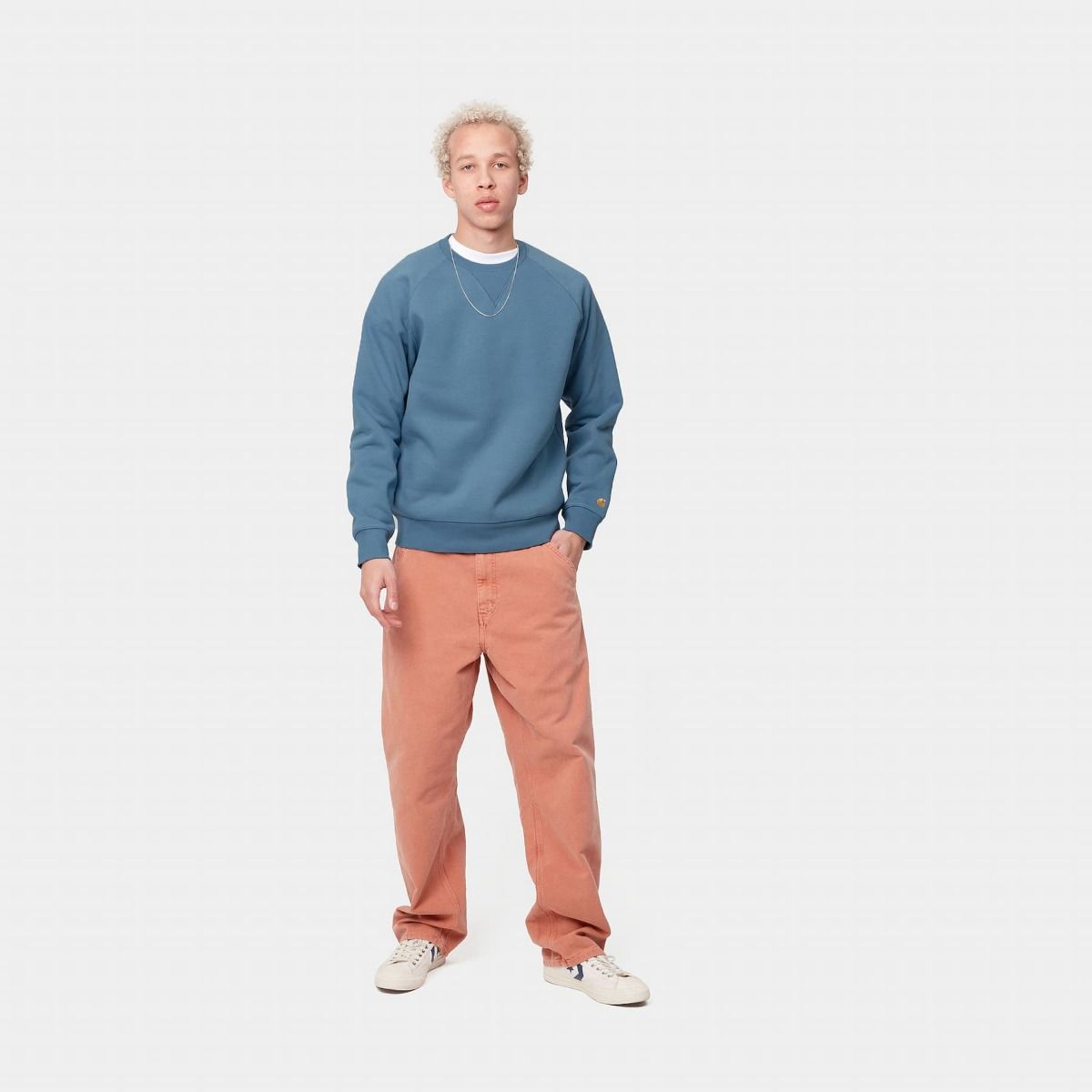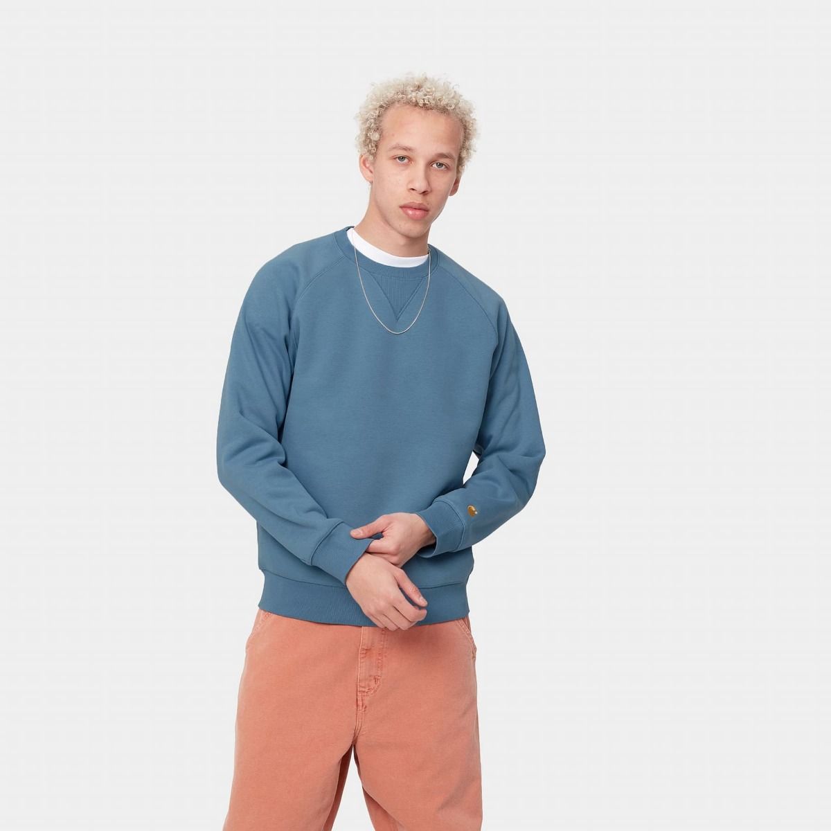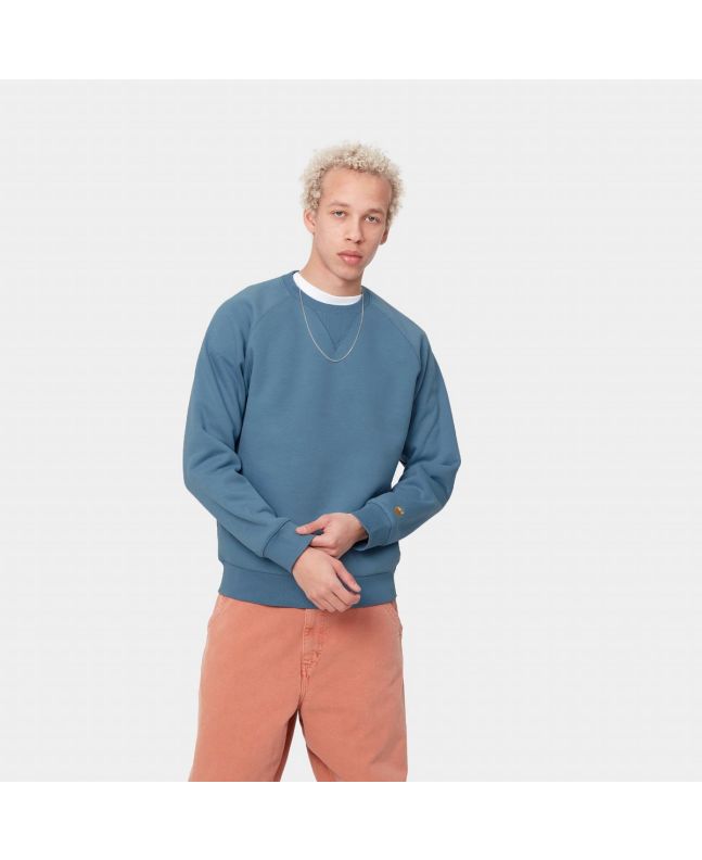 La Chase Sweat para hombre de Carhartt WIP está disponible en color azul (Icy Water-Gold).