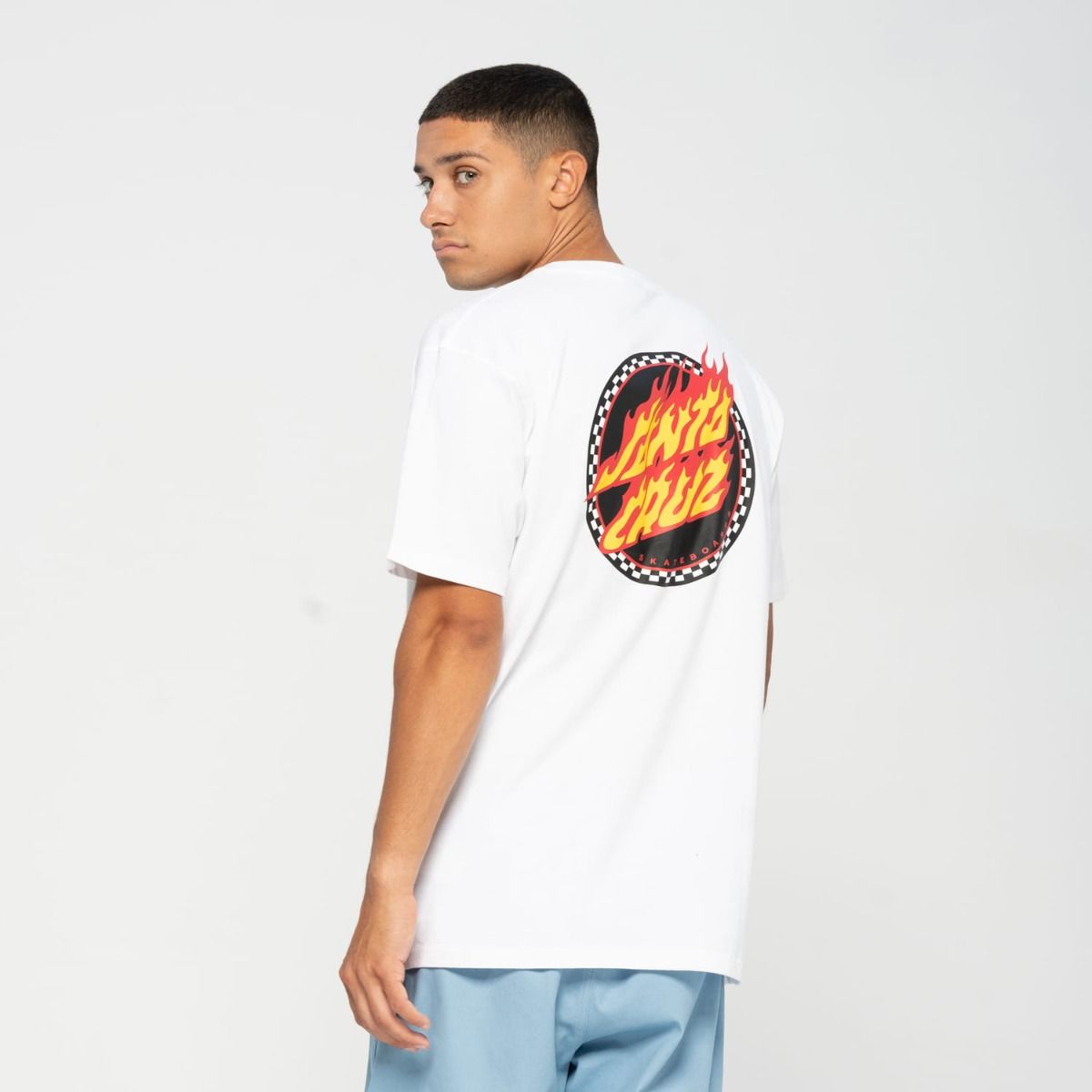 Esta camiseta de ajuste regular cuenta con cuello redondo, manga corta y estampado check junto con el logo de Santa Cruz Skateboards en llamas impreso en el lateral izquierdo del pecho y la espalda.
