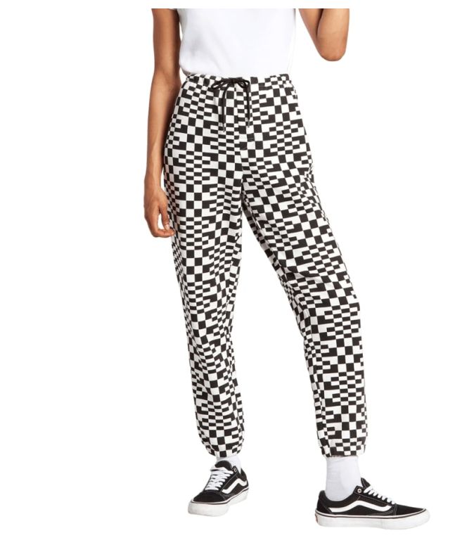 El pantalón para mujer Check U Out de Volcom en color negro y blanco a cuadros (Black-White) ha sido confeccionado con tejido punto mezcla de algodón, poliéster y fibras recicladas Repreve™.