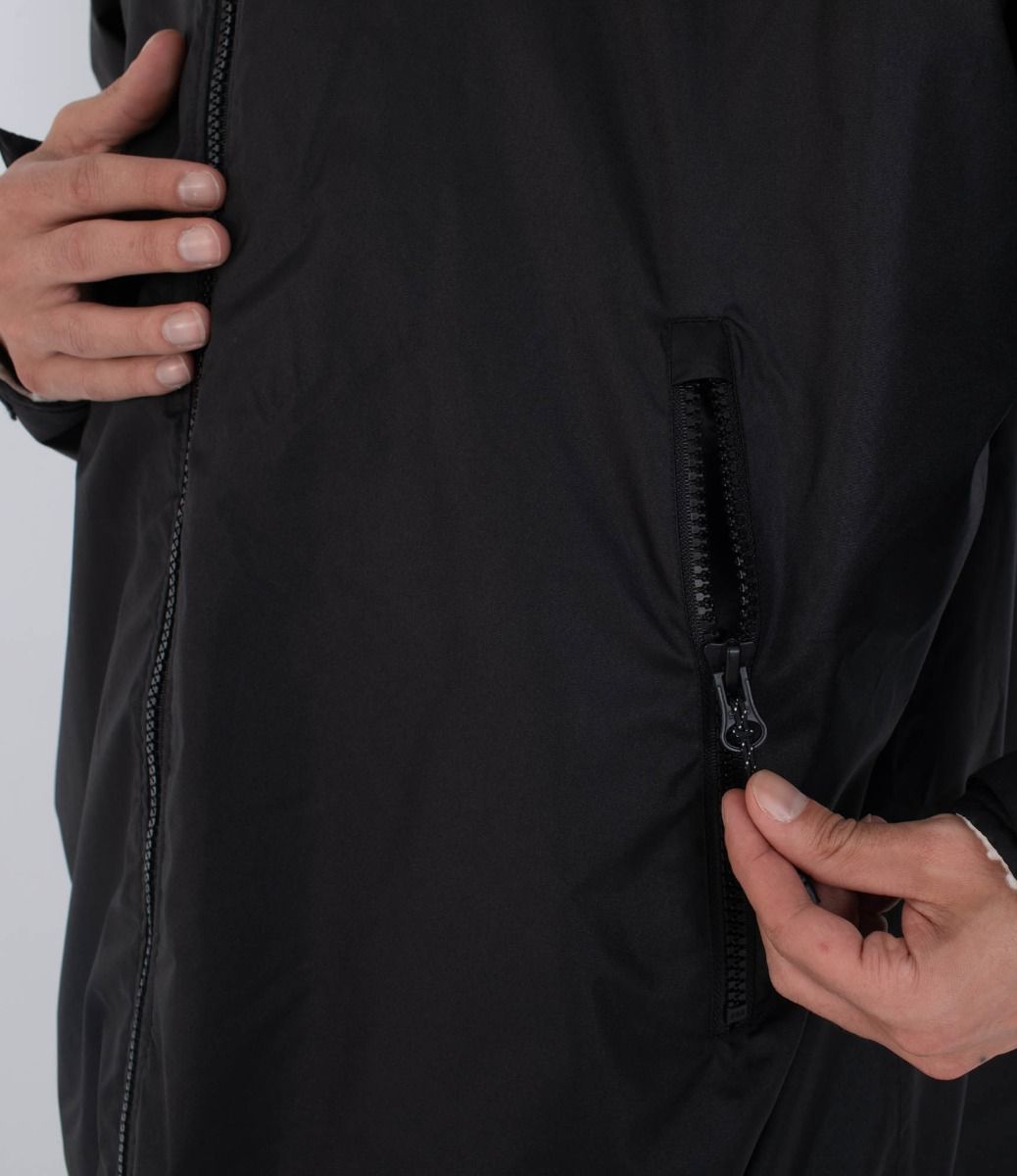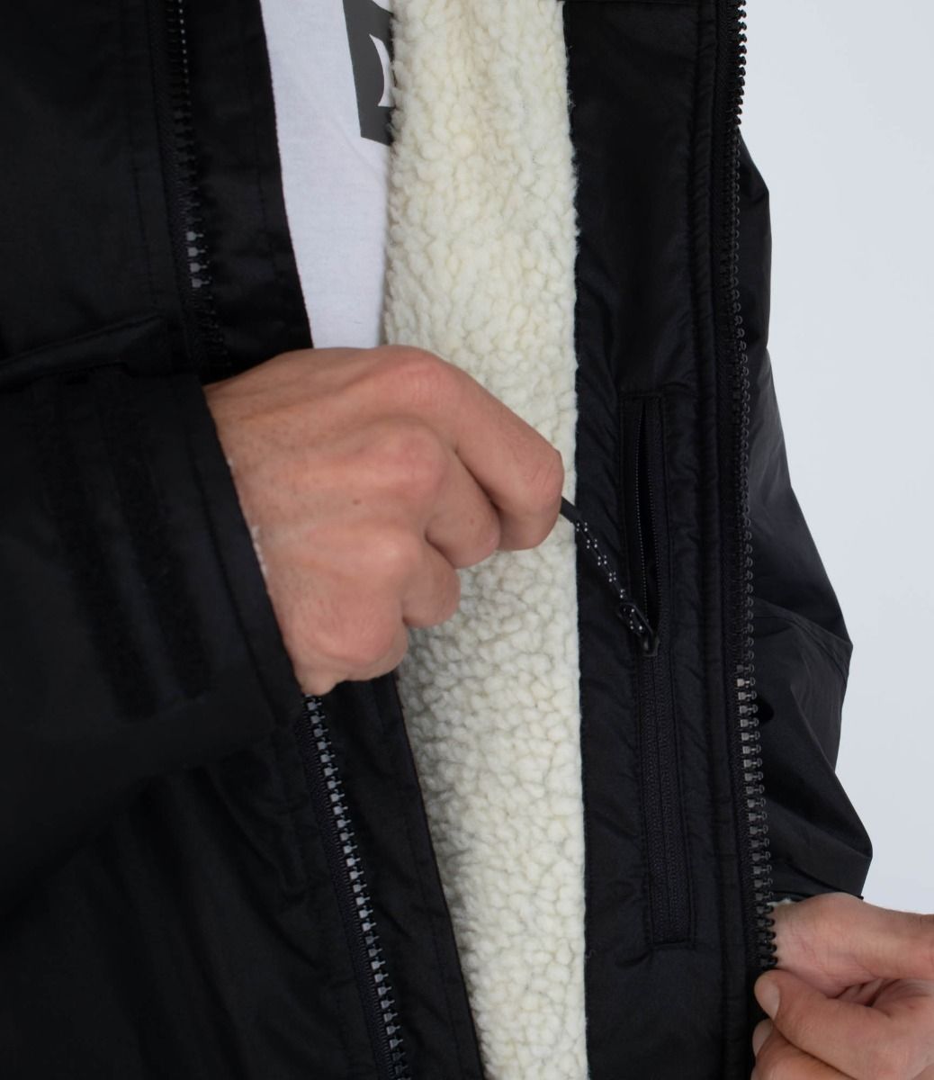 El interior forrado con sherpa de 200g añade una capa de aislamiento térmico que marca la diferencia en los días más frescos. Las mangas forradas en poliéster facilitan la movilidad al vestir y desvestir. El ajuste con velcro en los puños, las cremalleras laterales y la doble cremallera frontal hacen que este poncho cambiador sea extremadamente práctico y cómodo de usar, tanto en el spot como en la ciudad.
