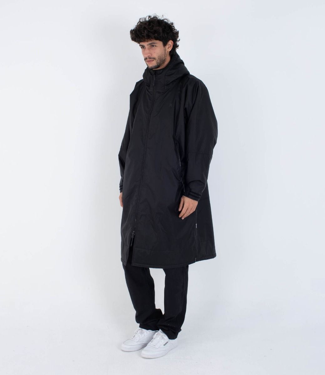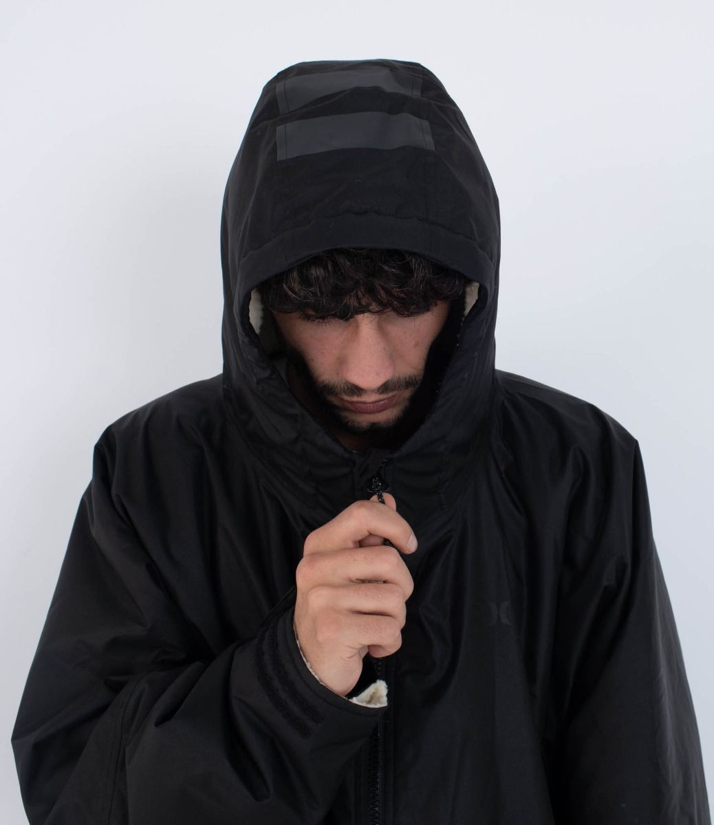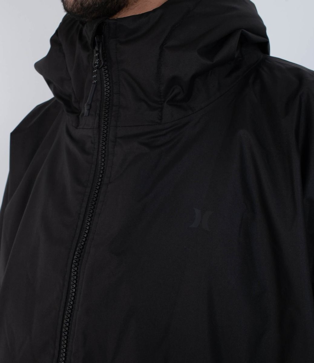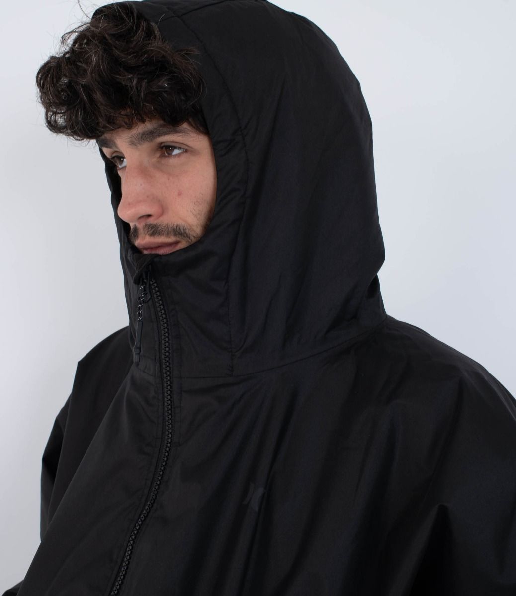 Minimalismo funcional: el logo Hurley tono sobre tono aparece sutilmente en el pecho y en la parte superior de la capucha, dejando todo el protagonismo a la silueta envolvente y al tejido técnico negro. Un básico técnico que se adapta a cualquier situación.