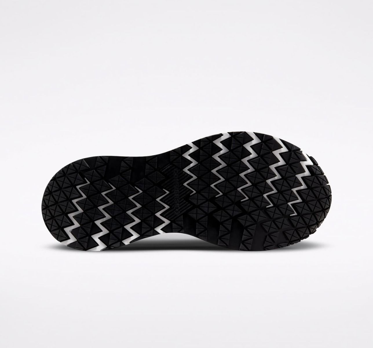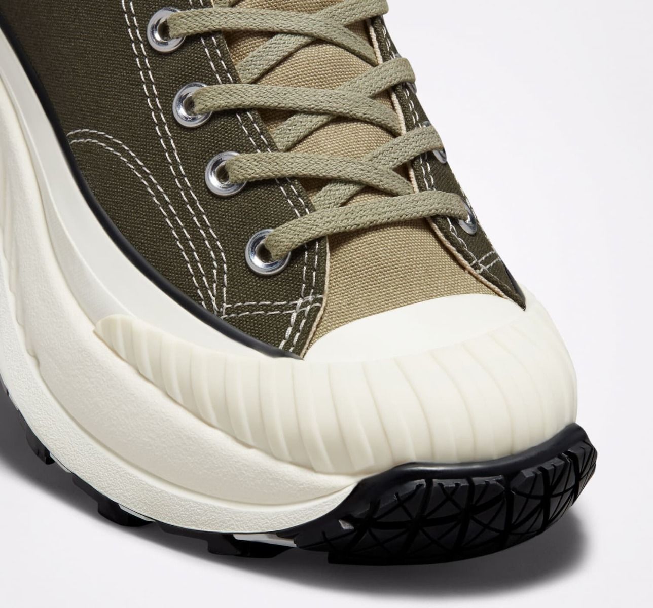Las Chuck 70 AT-CX combinan detalles clásicos de las Chuck 70 como el parche de estrella en el tobillo, los dos agujeros con borde metálico en la parte inferior y cordones de algodón, con una suela exterior de estilo futurista y agarre en forma de diamante para lograr mayor tracción.