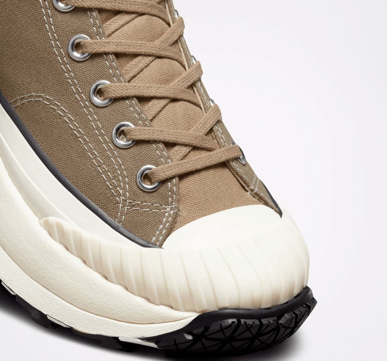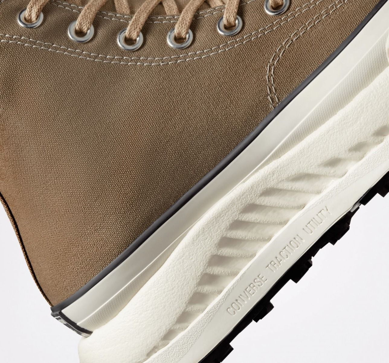Las zapatillas Chuck 70 AT-CX High Top color caqui con plataforma en tono crema y detalles en negro (Sandalwood-Egret-Black) están confeccionadas con lona.