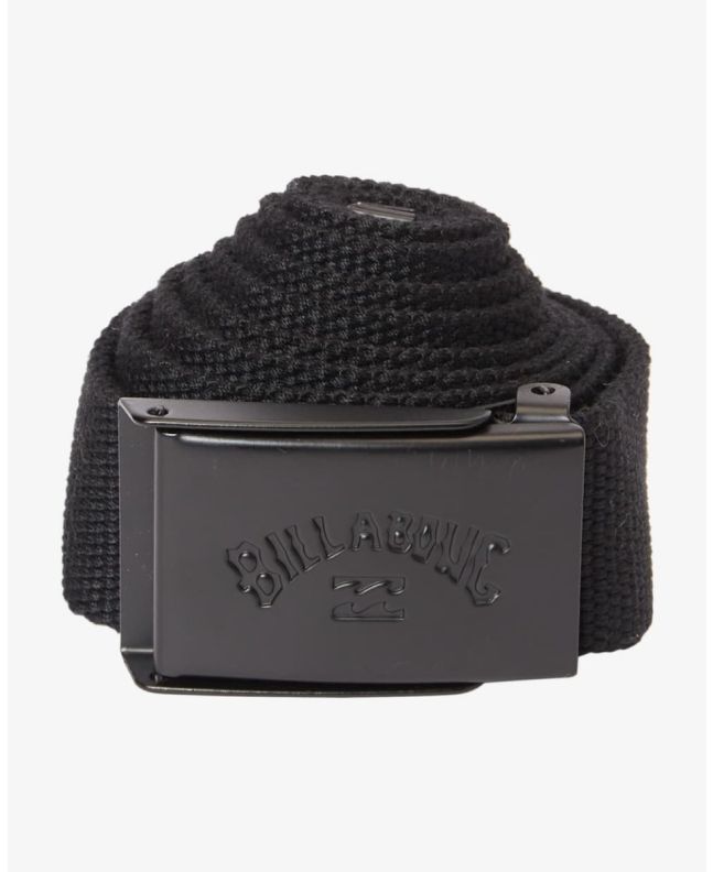 Este cinto masculino negro de talla ajustable cuenta con 35mm de ancho, 110cm de largo, cierre de hebilla metálica de clip, punta metálica, hebilla con abrebotellas en la parte posterior y grabado en relieve Billabong tanto en la hebilla como en la punta.