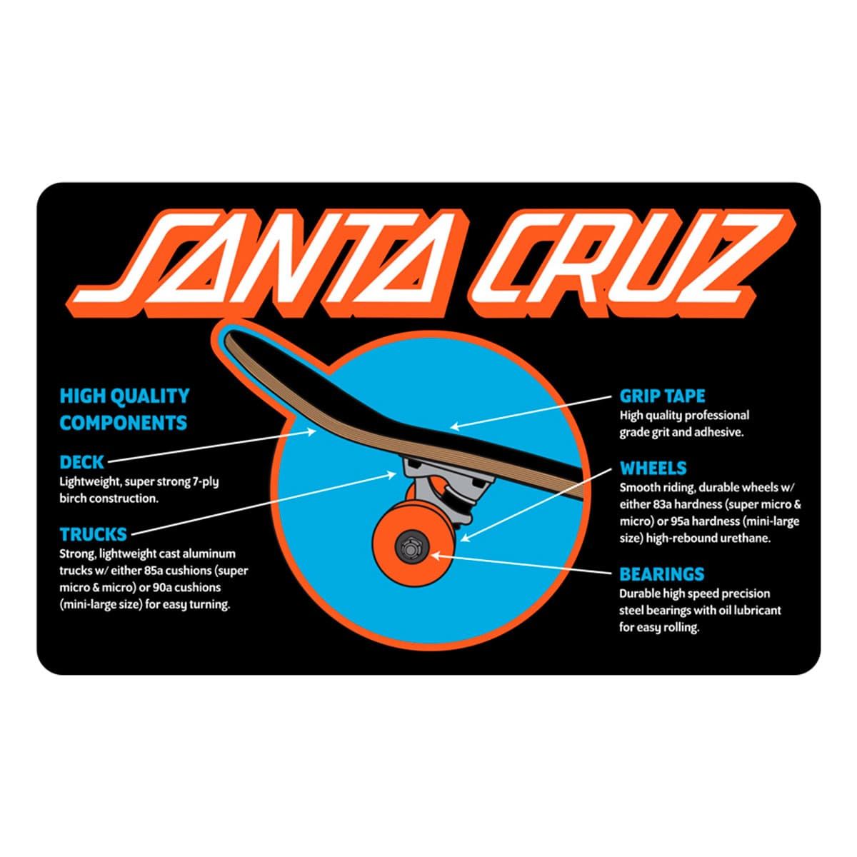 Este monopatín de Santa Cruz cuenta con cóncavo medio, ejes fuertes y ligeros de aluminio fundido con gomas de 85a para girar fácilmente, ruedas suaves y duraderas elaboradas con uretano de alto rebote y dureza 83a, rodamientos de alta velocidad de acero de precisión previamente lubricados para facilitar la rodadura y griptape de calidad profesional.