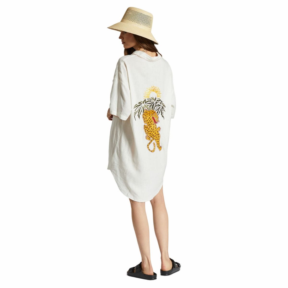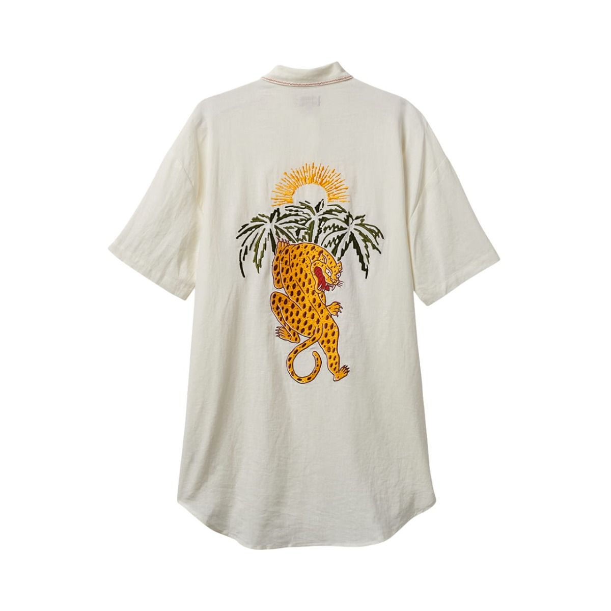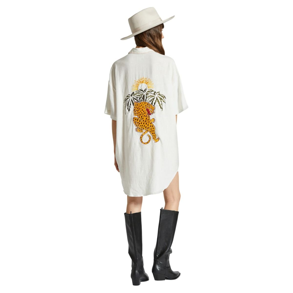 Este cómodo vestido veraniego cuenta con ajuste relajado, cierre frontal de botones, un bolsillo de parche en el pecho, un jaguar bordado en la espalda, costuras en contraste en el bolsillo y el cuello, junto con un largo de 33" desde el punto más alto del hombro hasta el dobladillo.