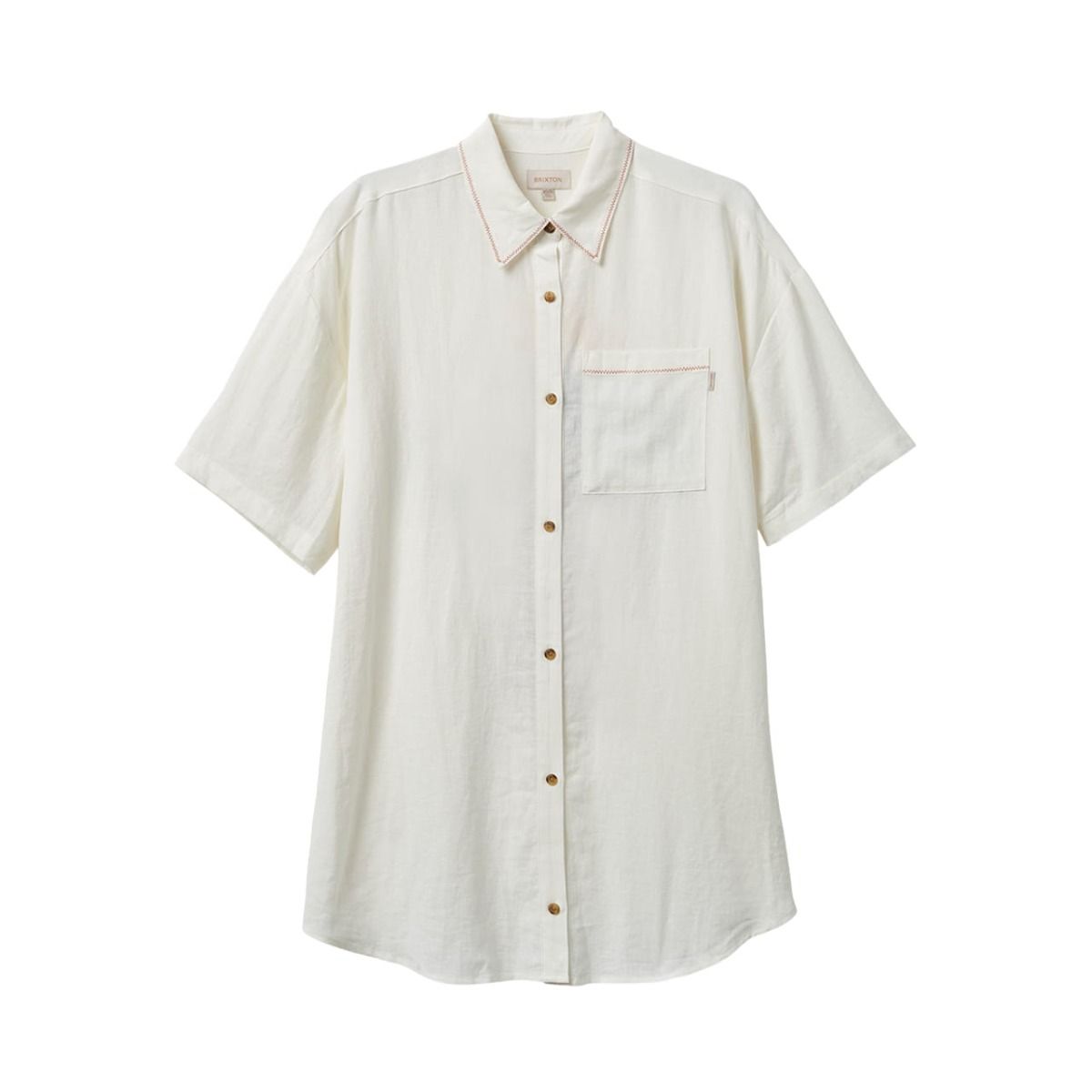 El vestido camisero Condesa Linen Blanco para mujer tiene una etiqueta de garantía Brixton en el interior.