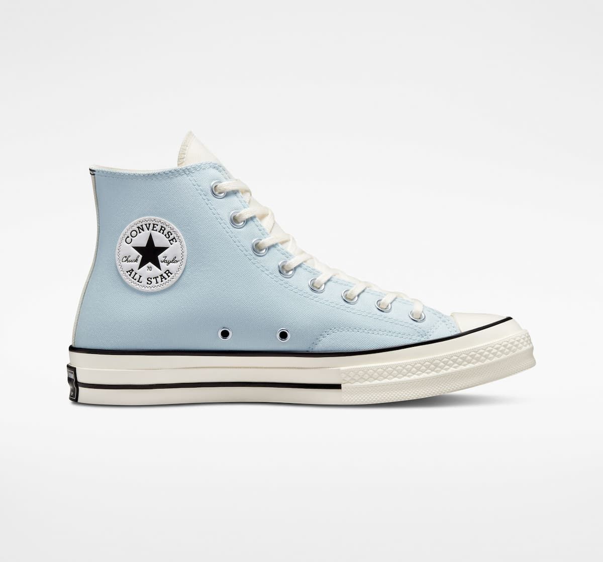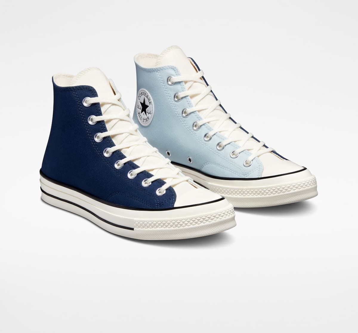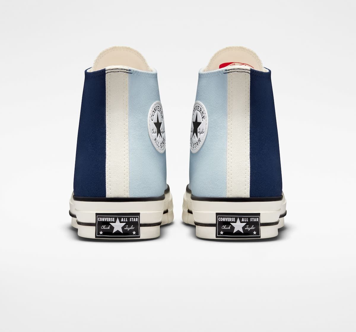 Las deportivas de corte alto Chuck 70 Hi Navy-Aqua Mist-Egret cuentan con parte superior de lona Premium en tres bloques de color, plantilla con amortiguación Premium OrthoLite para mayor comodidad y ligereza, mediasuela de estilo clásico en tono blanco garza brillante, costuras en la lengüeta con alas para un mejor ajuste, cordones blancos de algodón duradero, el icónico parche de estrella de estilo vintage en el tobillo, junto con suela exterior de goma.