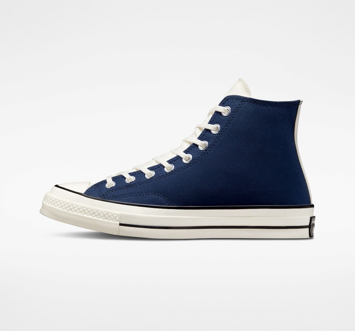 Las zapatillas para hombre y mujer Chuck 70 Nautical Tri-Blocked High Top en tono azul marino, aguamarina y blanco garza (Navy-Aqua Mist-Egret) están confeccionadas con lona Premium.