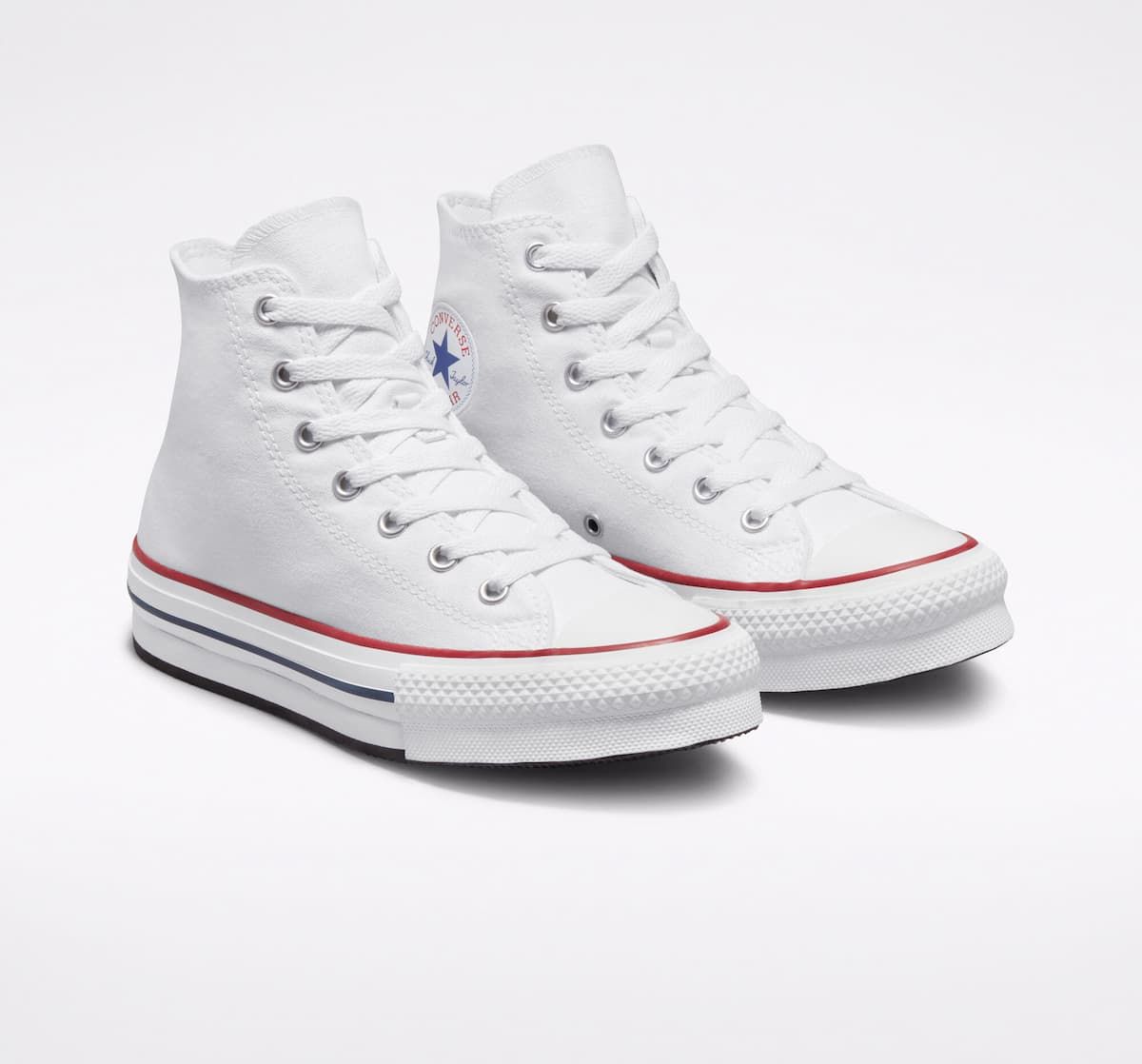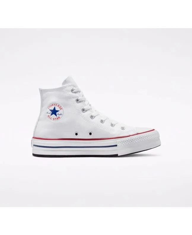 Las deportivas Chuck Taylor All Star de plataforma EVA Lift Canvas High Top blancas cuentan con una plataforma de espuma EVA para un estilo más elevado, junto con detalles clásicos de las Chuck Taylor de siempre como la parte superior de lona transpirable, ligera y resistente, perfil alto, los dos ojales metálicos en la zona media para mejorar la circulación del aire, puntera de goma reforzada, las rayas en contraste de la entresuela, suela exterior de goma con patrón de agarre en forma de diamante, el logo Converse All Star impreso en el talón y el icónico parche All Star en el tobillo.