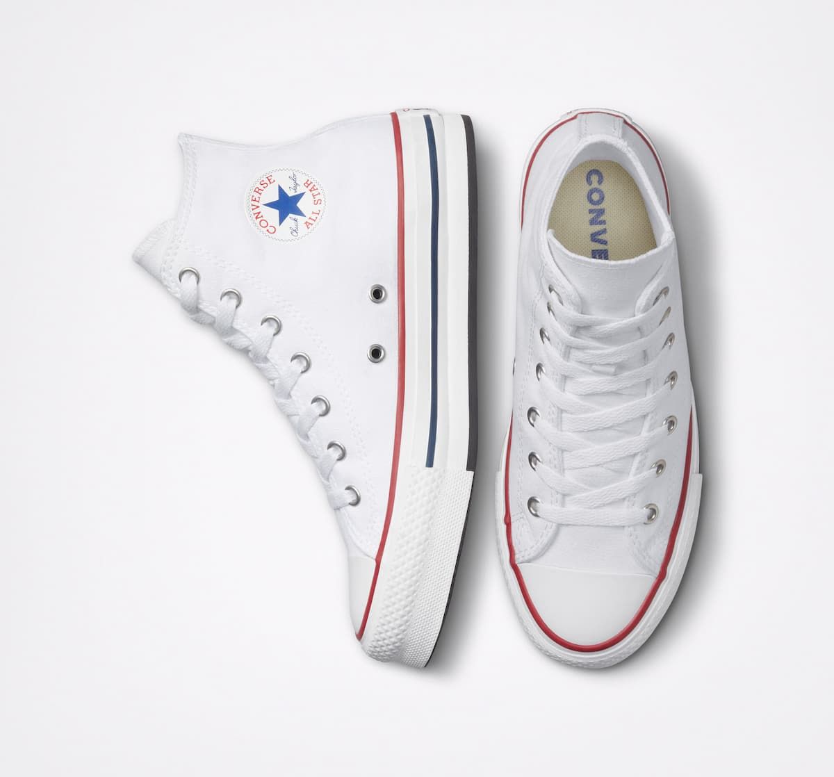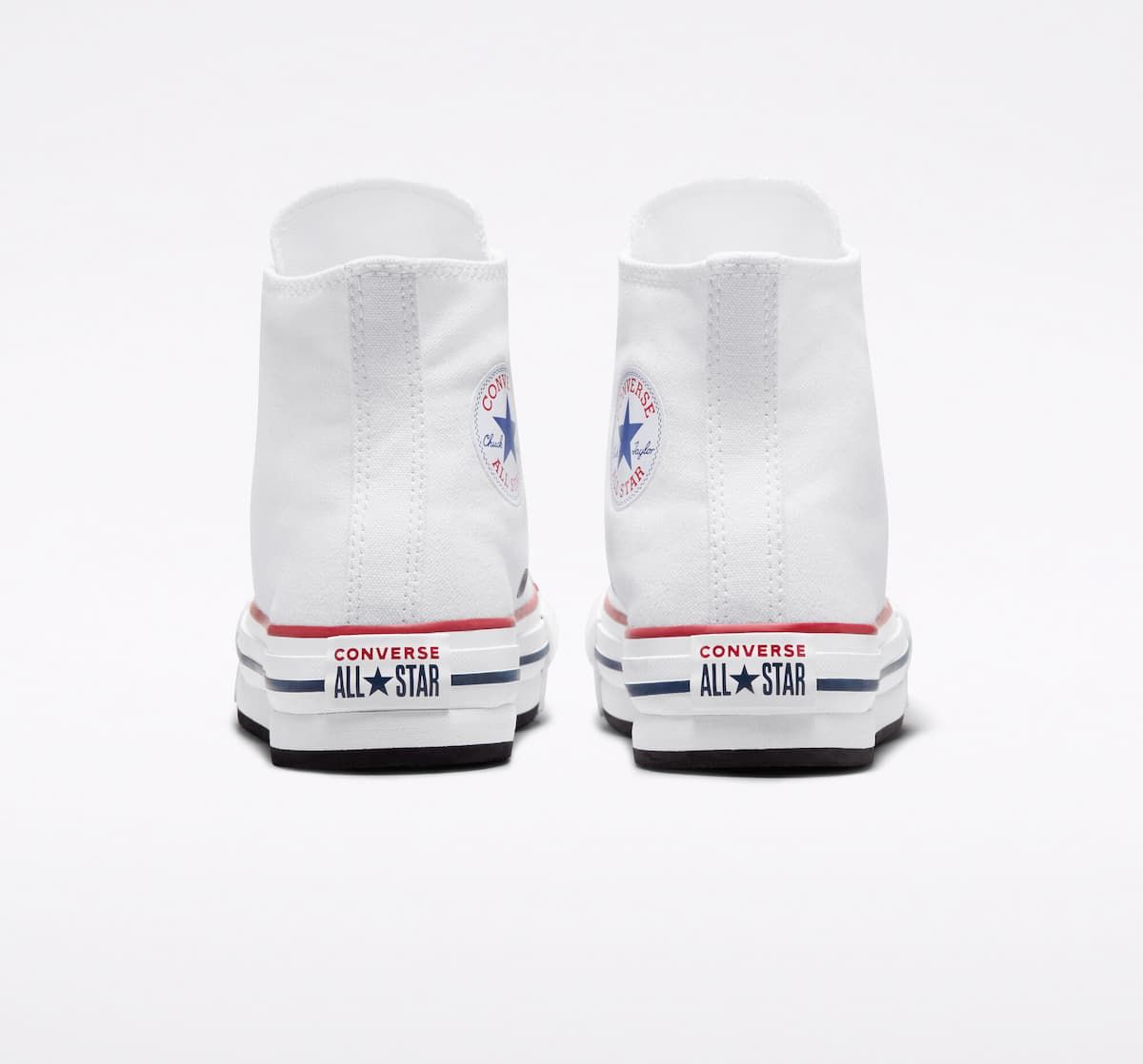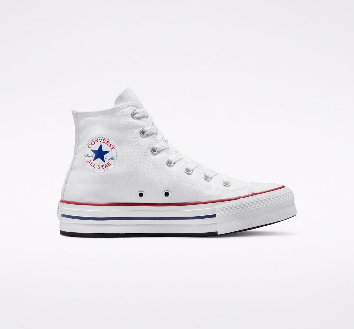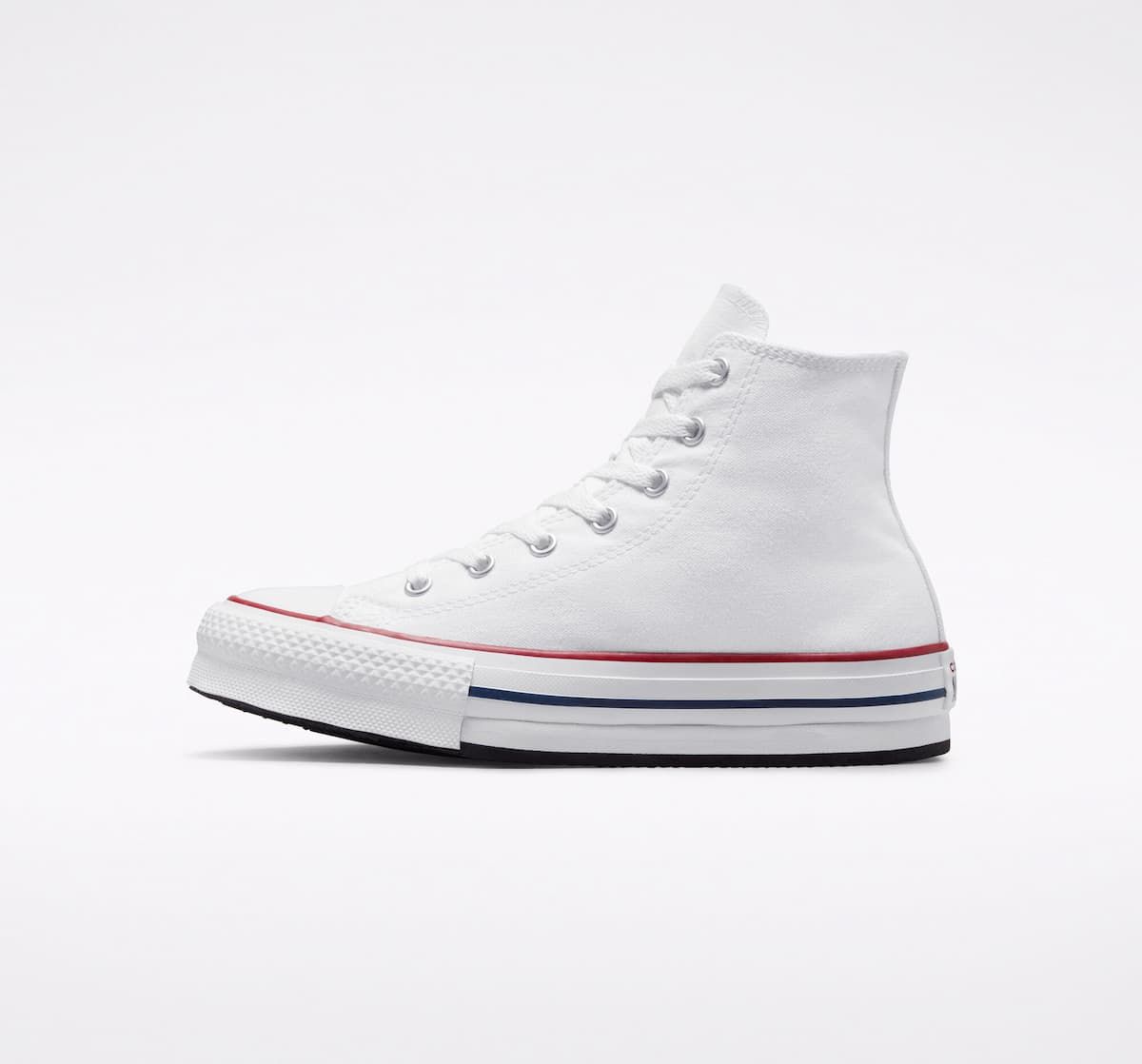 Las zapatillas de plataforma Chuck Taylor All Star EVA Lift Canvas Platform High Top en blanco con detalles en granate y azul marino (White-Garnet-Navy) de Converse están confeccionadas con lona y goma EVA.