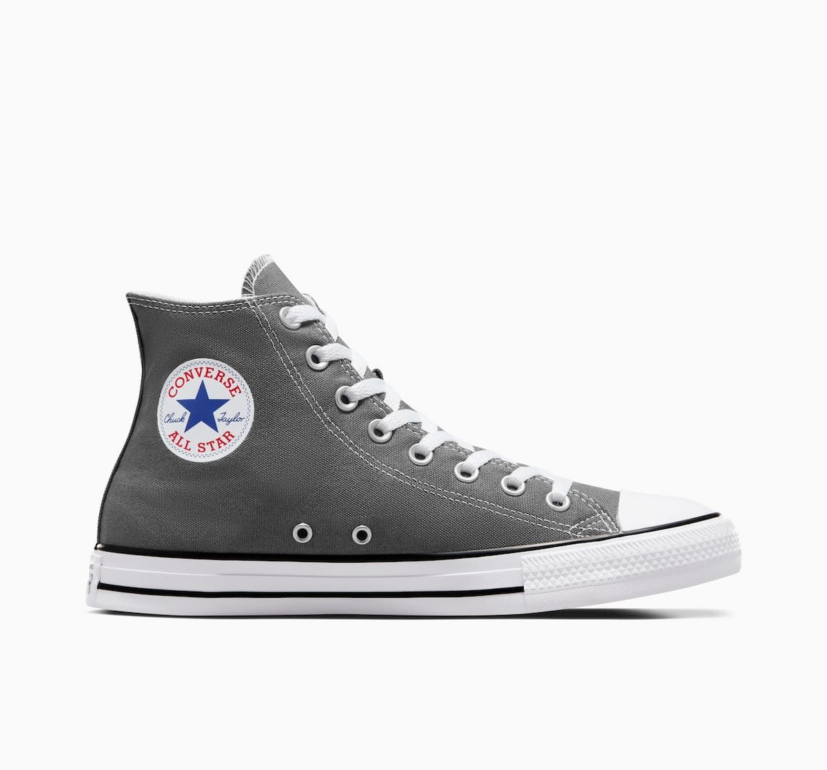 Las clásicas Chuck Taylor All Star Hi Charcoal cuentan con corte alto, parte superior de lona transpirable, ligera y resistente, dos agujeros metálicos en el laterales para mayor transpirabilidad, cierre de cordones, puntera de goma reforzada, el clásico parche All Star en el tobillo y suela de caucho vulcanizada.