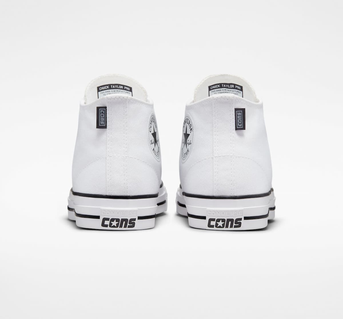 Las Converse CONS Chuck Taylor All Star Mid Top blancas cuentan con parte superior de lona reciclada recubierta de goma, lengüeta elástica para que se mantenga en su sitio, una capa extra de goma en la parte baja de los laterales, plantilla de espuma CX moldeada para mayor amortiguación y protección contra impactos, suela de goma de tracción para un agarre óptimo a tu tabla de skate, los dos agujeros con borde metálico en la parte inferior característicos de las All Star y cordones blancos de polialgodón para mayor durabilidad.