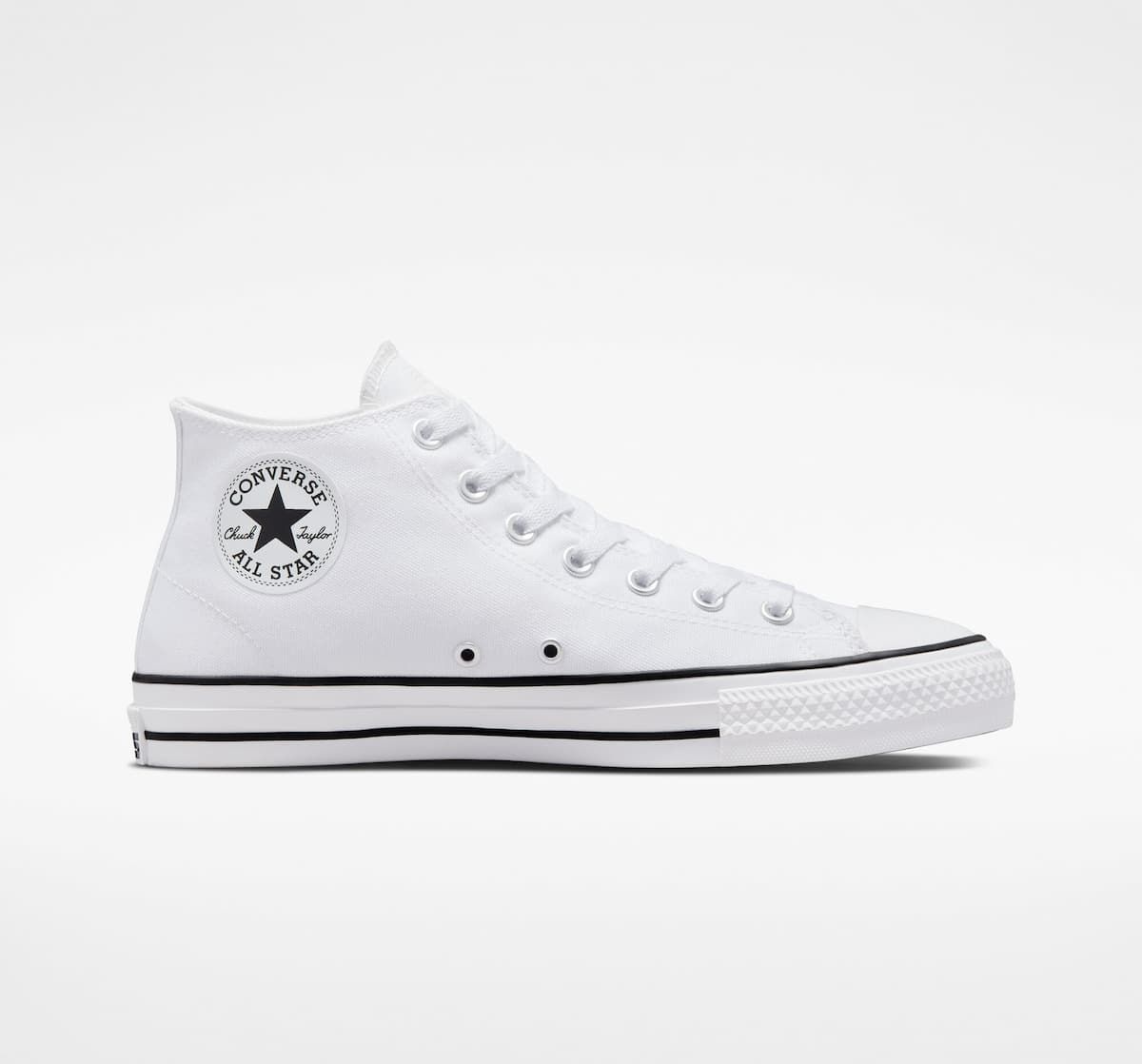 Las zapatillas de skate para hombre y mujer CONS Chuck Taylor All Star Pro Mid Top en blanco con detalles en negro (White-White-Black) de Converse están confeccionadas con lona reciclada y goma.