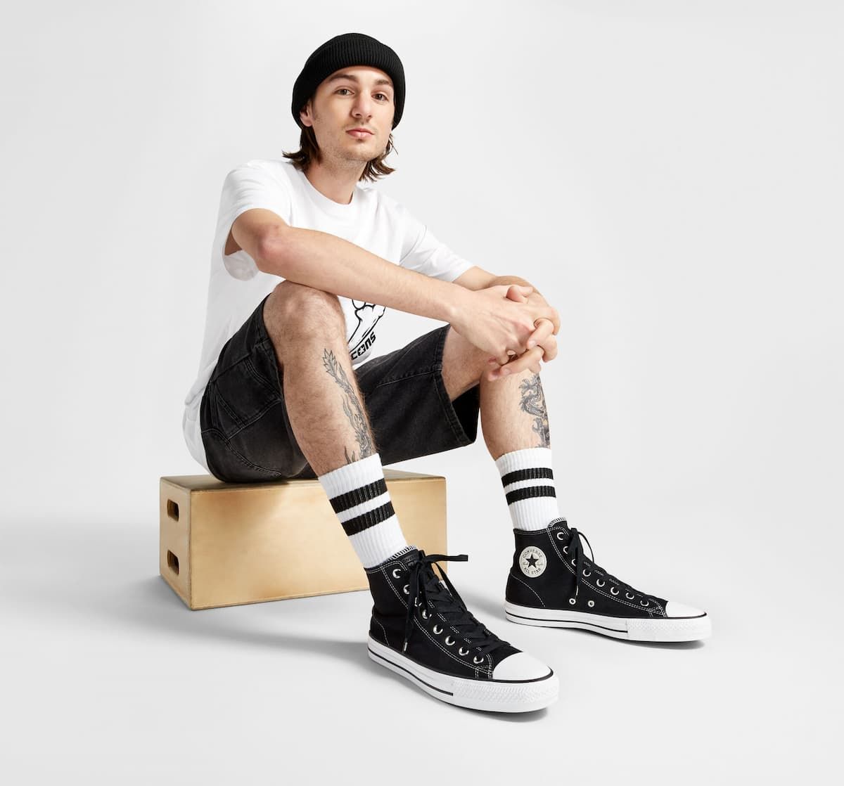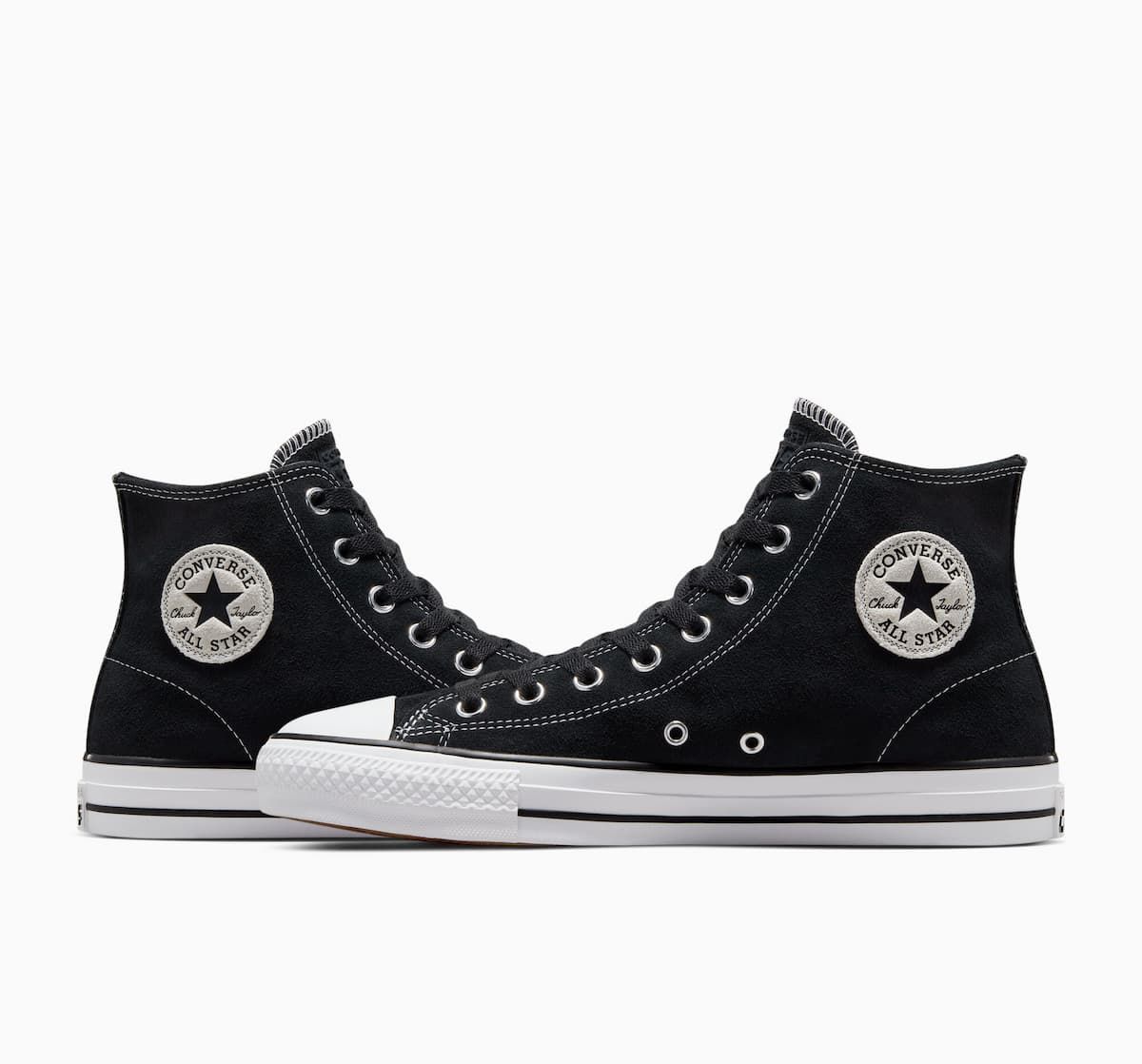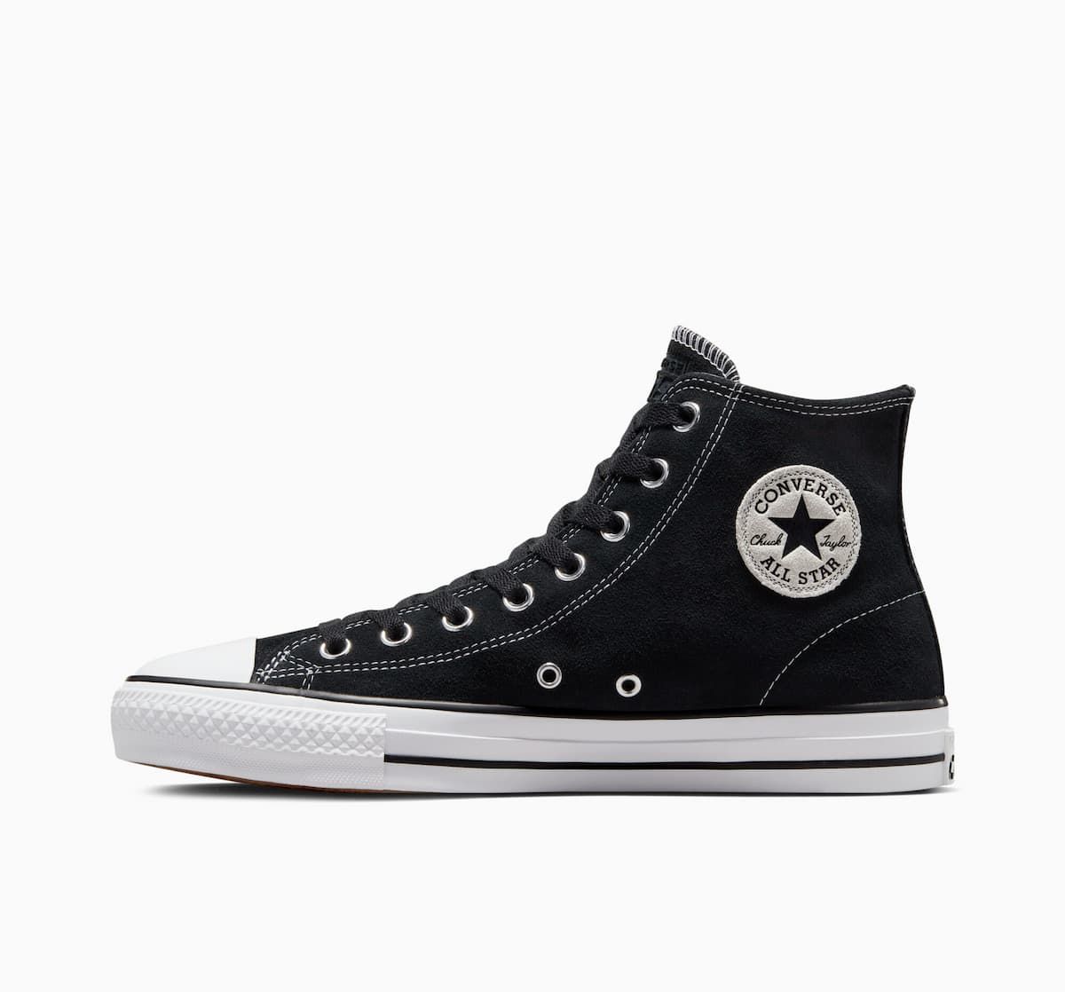 Las Converse CONS Chuck Taylor All Star Pro Suede High Top negras y blancas cuentan con parte superior de ante reforzada con goma, lengüeta elástica con refuerzos en goma para que se mantenga en su sitio mientras patinas, plantilla de espuma CX moldeada para mayor amortiguación y protección contra impactos, suela exterior de goma CONS para un agarre óptimo a tu tabla de skate, los dos agujeros con borde metálico en la parte inferior característicos de las All Star y cordones negros de polialgodón para mayor durabilidad.