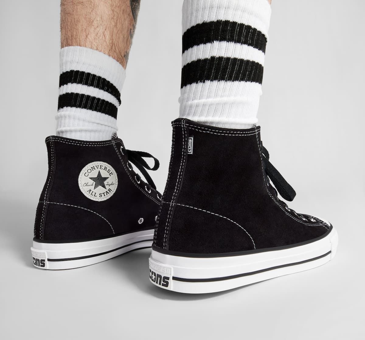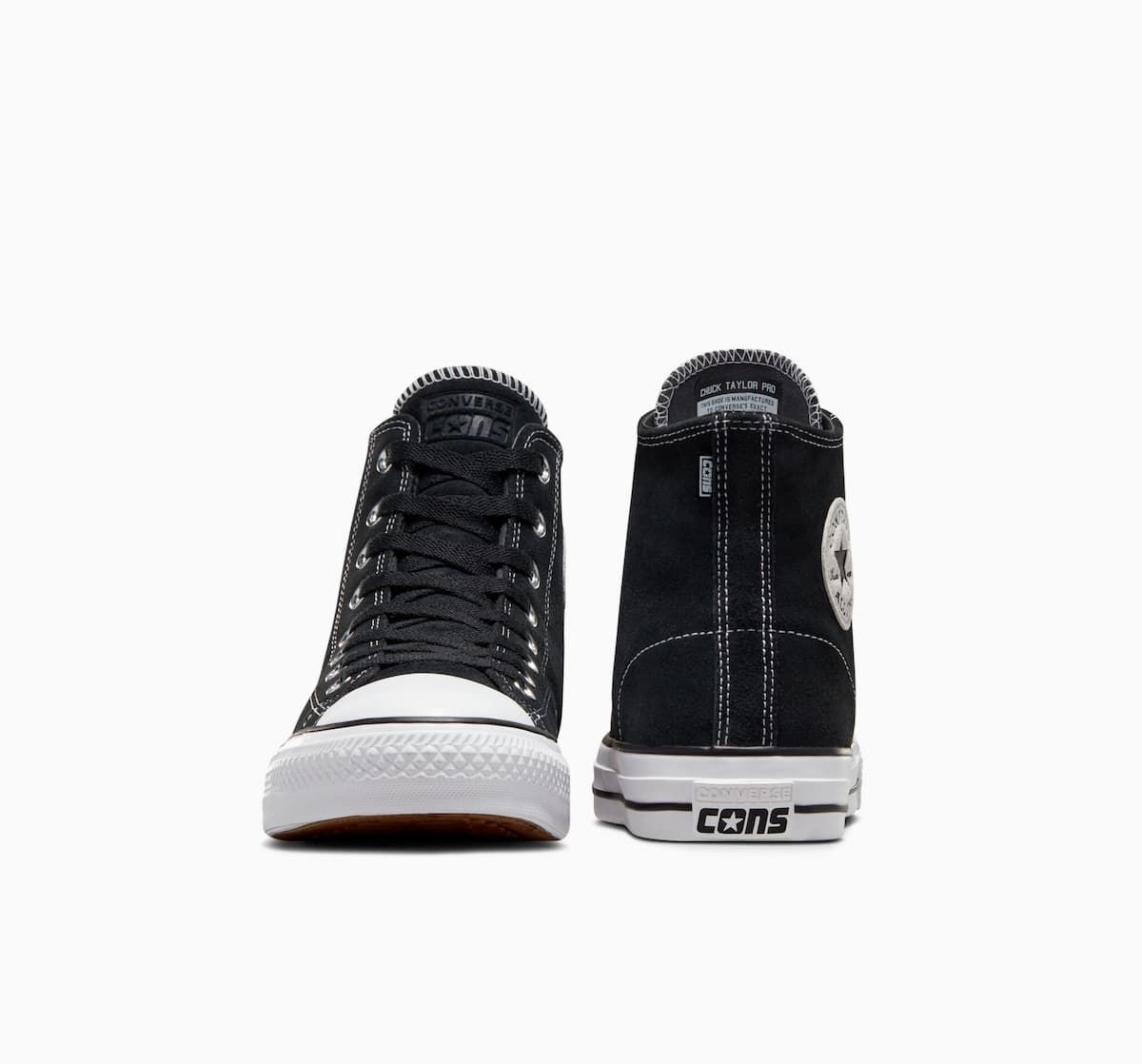 Las zapatillas de caña alta para skate CONS Chuck Taylor All Star Pro Suede negras y blancas tienen el sello de garantía Converse CONS.