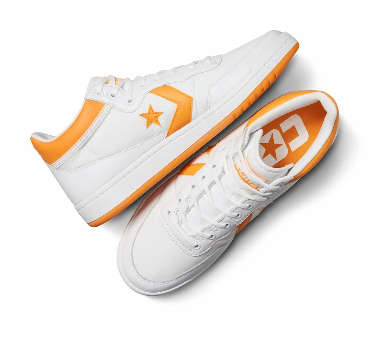Las deportivas para skate Unisex Converse CONS Fastbreak Pro Mid blancas y amarillas cuentan con un perfil de corte medio para lograr mayor estabilidad sobre la tabla, parte superior de piel con el look clásico de las Fastbreak, plantilla de espuma CX moldeada para mayor amortiguación y protección contra impactos, suela exterior de goma de tracción, cordones blancos y la estrella clásica Chevron bordada en amarillo en el lateral.