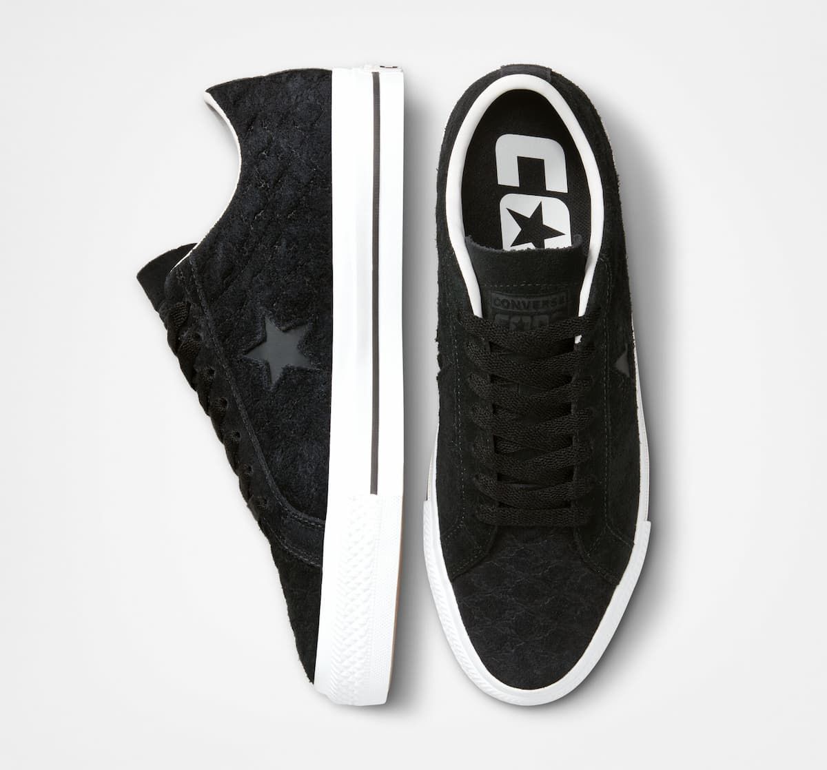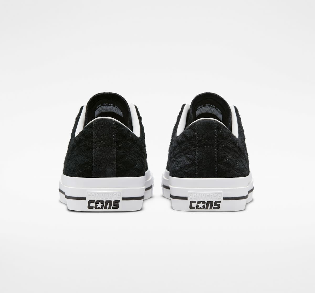 Las Converse One Pro Bones negras y blancas cuentan con un perfil bajo para una flexibilidad máxima, parte superior de ante con refuerzo de goma, lengüeta elástica para que se mantenga en su sitio, amortiguación de espuma CX para mayor protección contra impactos, suela de goma de tracción para un agarre óptimo, cordones blancos de polialgodón para mayor durabilidad, estampado integral en relieve de huesos en referencia a las raíces del skateboarding y el icónico logotipo One Star en el lateral.