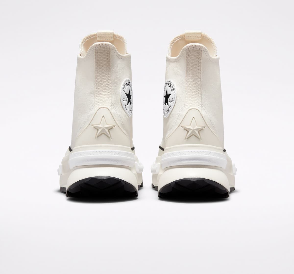 Las zapatillas Run Star Legacy CX en tono hueso con detalles en negro y blanco tienen la estrella Converse All Star grabada en el talón.