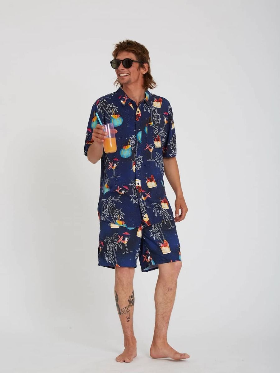La camisa surfera Cosmic Vaca de Volcom está disponible en azul con detalles estampados (Blueprint).