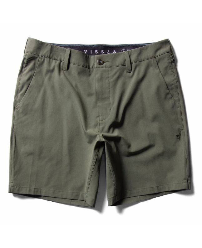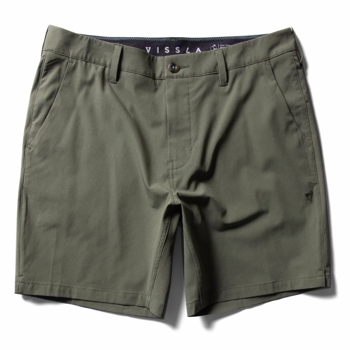 Estos shorts híbridos eco-friendly en tono verde militar presentan tejido texturizado elástico en 4 direcciones que se seca rápidamente, 17.5" (44,45cm) de largo, cintura forrada de chambray, forro de malla, cierre frontal con botón, bragueta con cremallera de espiral, bolsillos laterales, bolsillos posteriores (el izquierdo con cremallera) y el logo de Vissla bordado en tono sobre tono en la pierna izquierda.