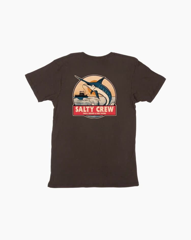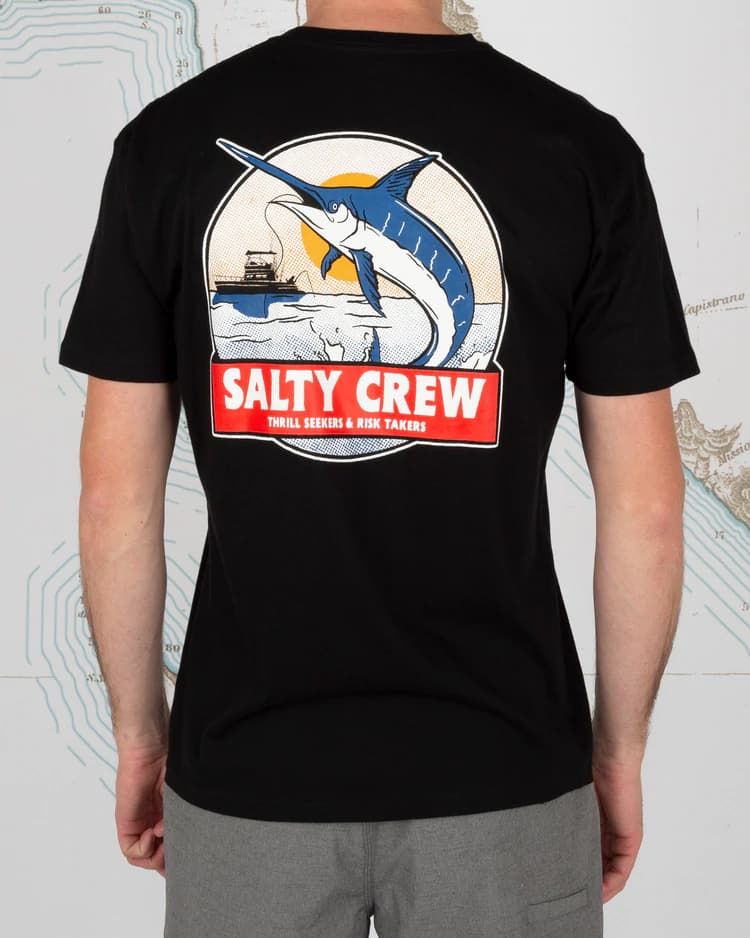 Esta camiseta de corte normal cuenta con cuello redondo, manga corta y estampado original de Salty Crew de un pez espada junto con la leyenda"Thrill Seakers and Risk Takers" (Los que buscan emociones y se arriesgan) serigrafiados en el lado izquierdo del pecho y la espalda.