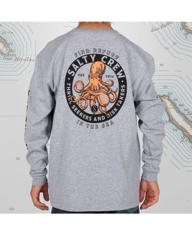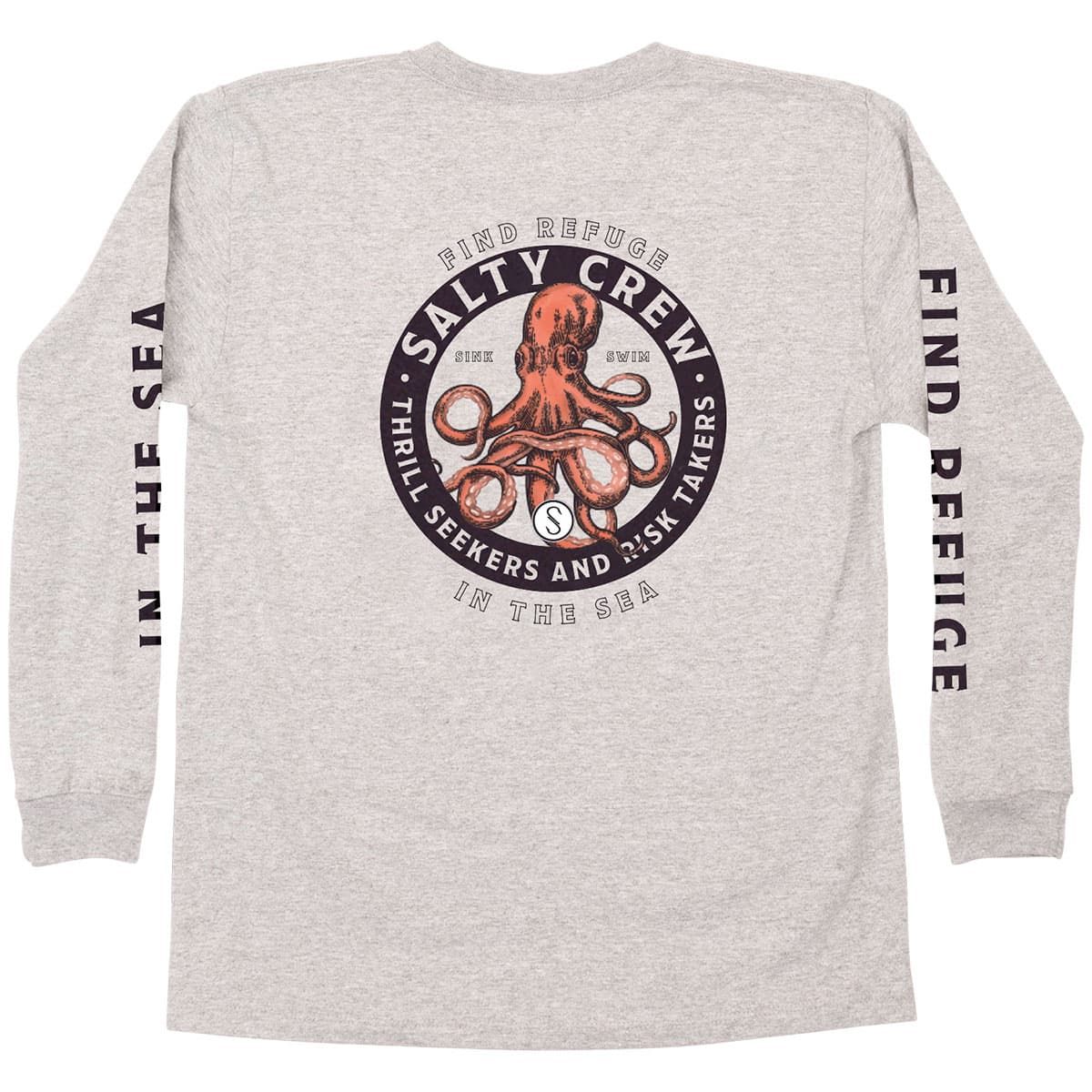 Esta camiseta de tejido suave cuenta con cuello redondo, manga larga, una ilustración de un pulpo y el logo de Salty Crew estampados, así como las frases “Find refuge in the sea” (Encuentra refugio en el mar) y "Thrill Seakers and Risk Takers" (Los que buscan emociones y se arriesgan) serigrafiadas en en el lado izquierdo del pecho, la espalda y las mangas.