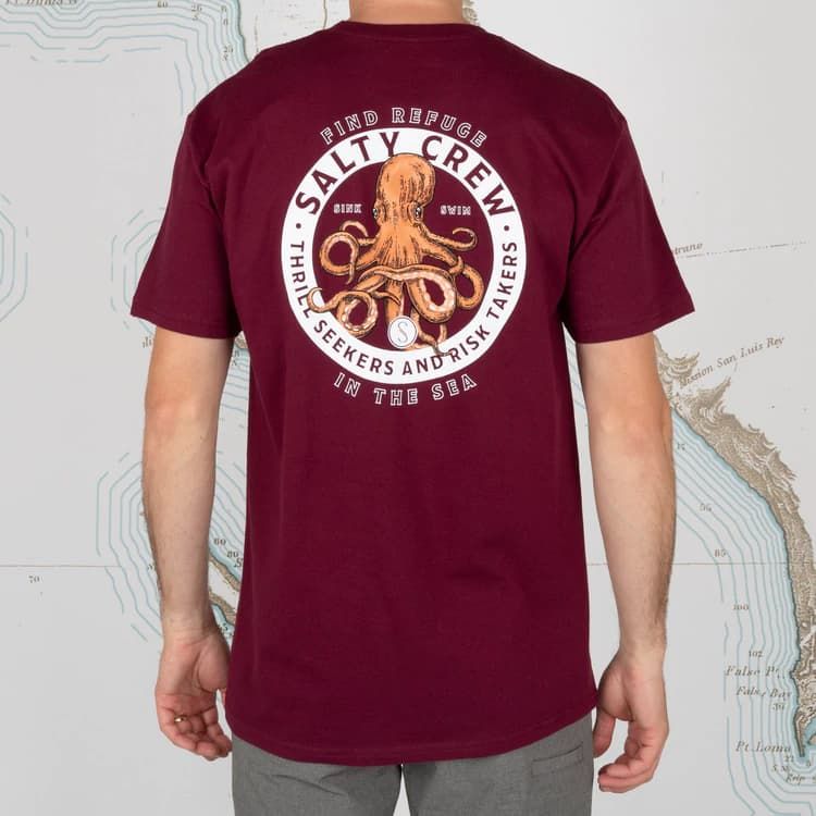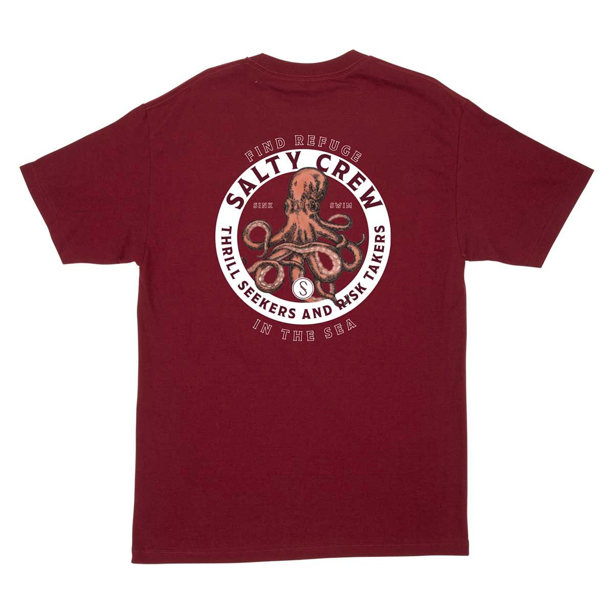 Esta camiseta de corte normal cuenta con cuello redondo, manga corta, una ilustración de un pulpo y el logo de Salty Crew estampados, así como las frases“Find refuge in the sea” (Encuentra refugio en el mar) y "Thrill Seakers and Risk Takers" (Los que buscan emociones y se arriesgan) serigrafiados en en el lado izquierdo del pecho y la espalda.
