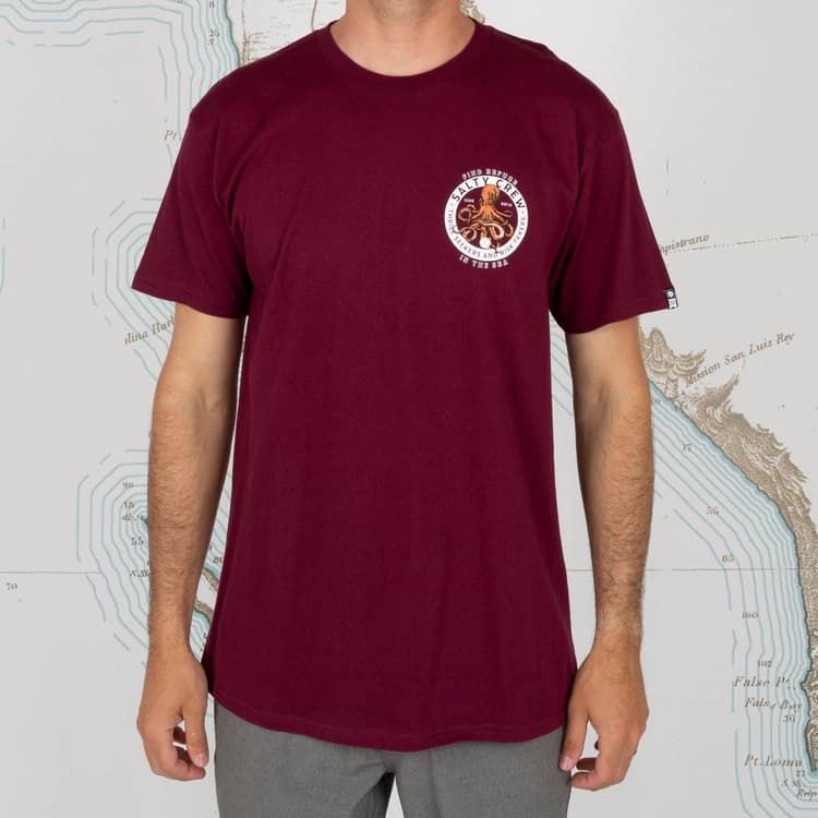 La camiseta de manga corta Deep Reach granate (Burgundy) para hombre de Salty Crew está confeccionada con tejido suave 100% algodón.