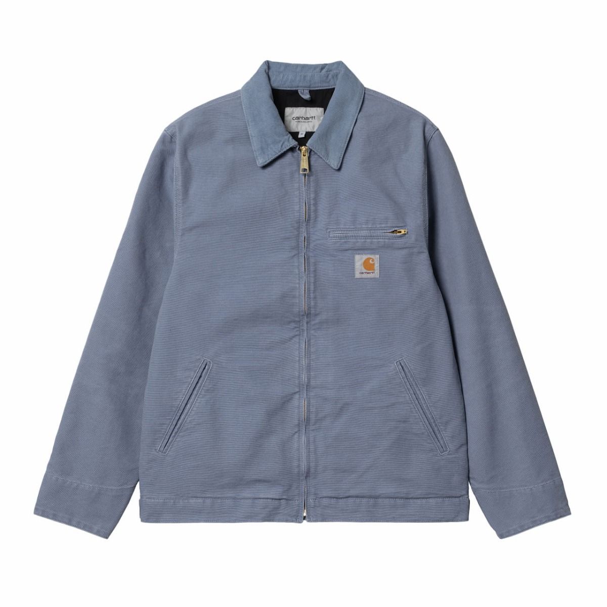Esta cazadora workwear para hombre en vibrante tono azulado cuenta con una silueta ligeramente recortada, cuerpo forrado de popelina, cuello de pana, mangas forradas de nailon, puños ajustables, banda en el dobladillo inferior, puntadas triples, cierre frontal de cremallera en tono dorado, un bolsillo en el pecho con cremallera, dos bolsillos laterales, un bolsillo interior y una etiqueta cuadrada con el logo de Carhartt tejida en el lado izquierdo del pecho.