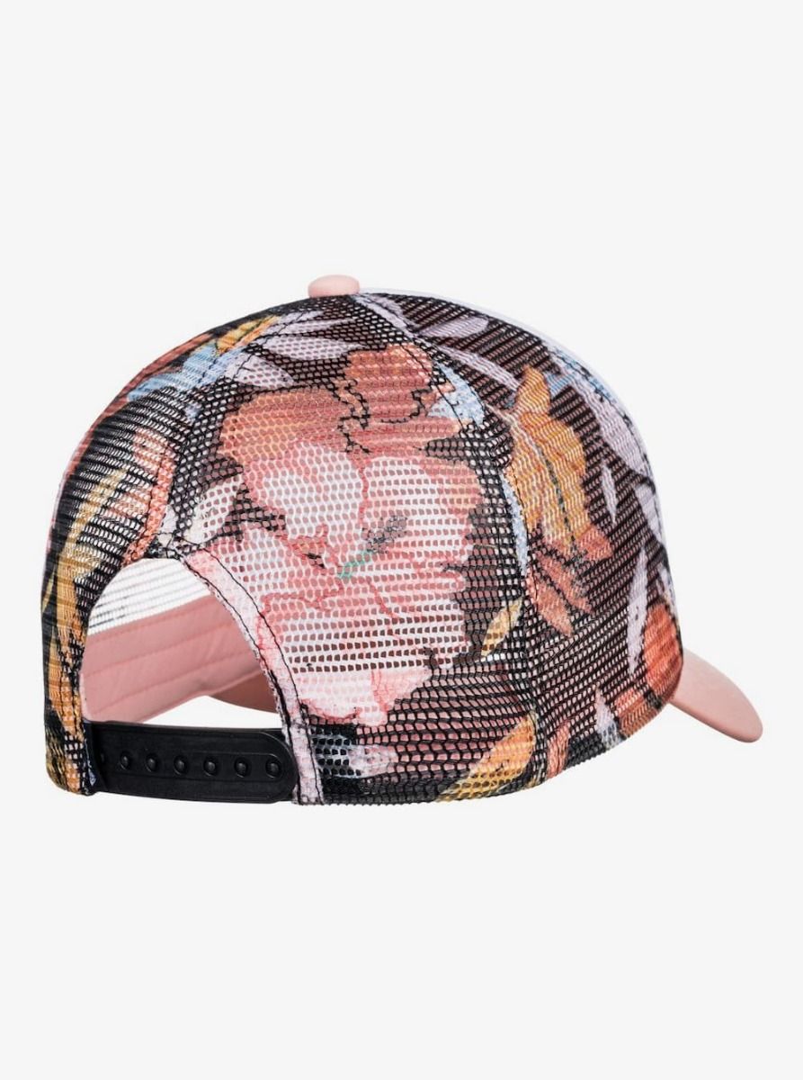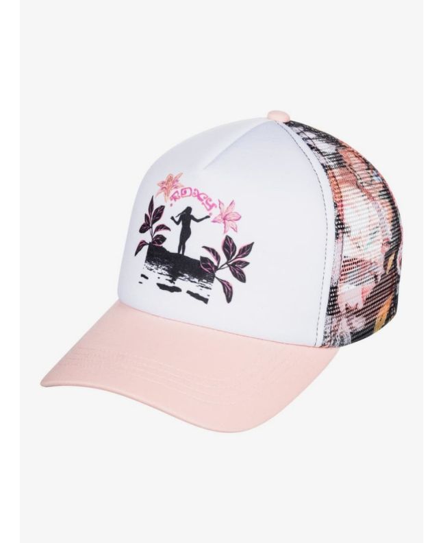 Esta gorra trucker cuenta con parte delantera de espuma, paneles laterales y traseros de malla, visera curvada, cierre ajustable posterior con broche a presión de plástico y serigrafía original Roxy en el frontal.