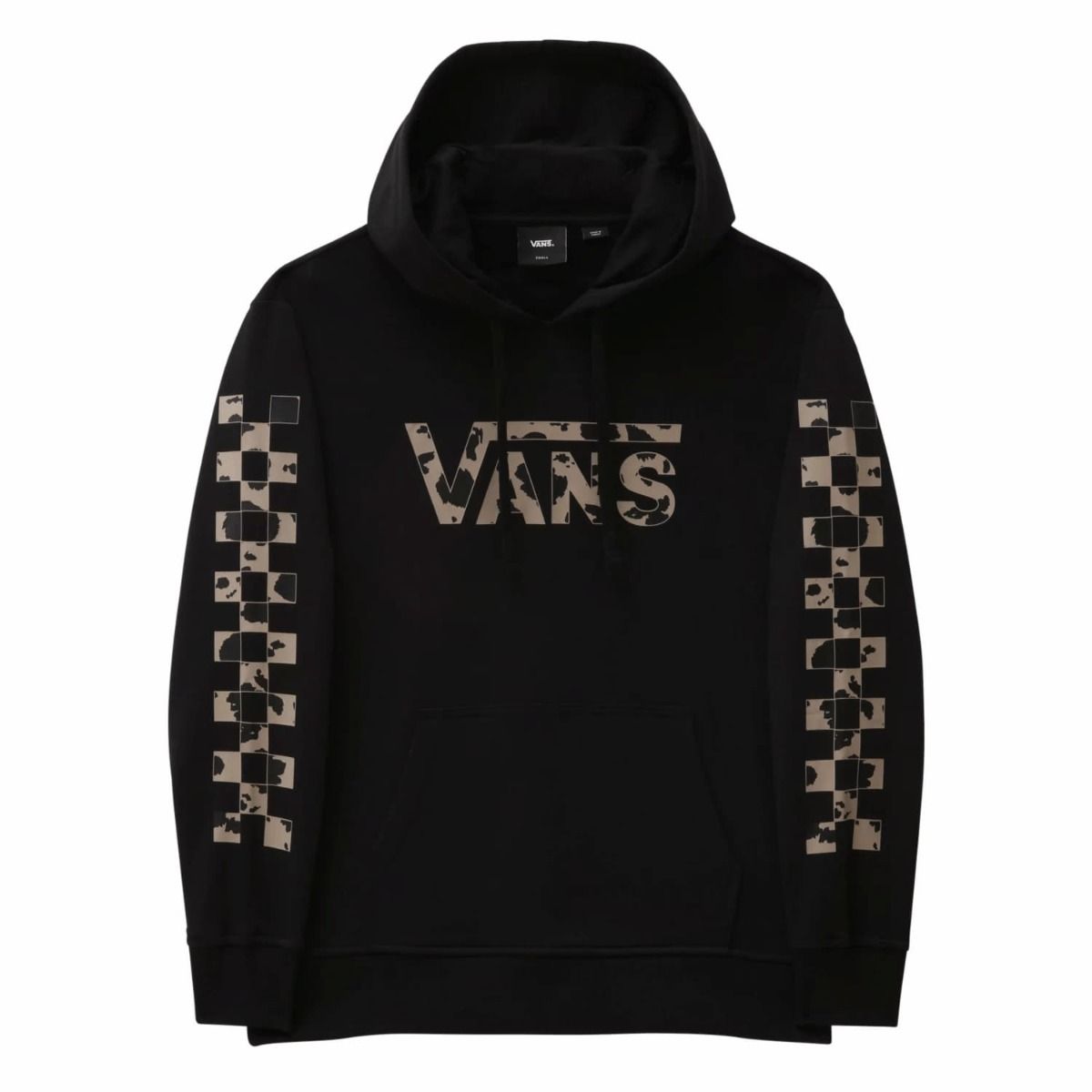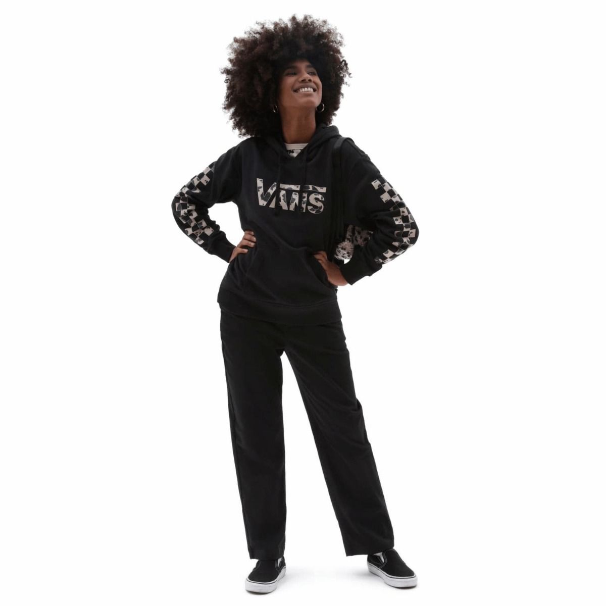 Este cómodo hoodie de corte boyfriend cuenta con capucha ajustable mediante cordón, un amplio bolsillo tipo canguro, estampado checkerboard en las dos mangas y el logo de Vans serigrafiado en la parte delantera.