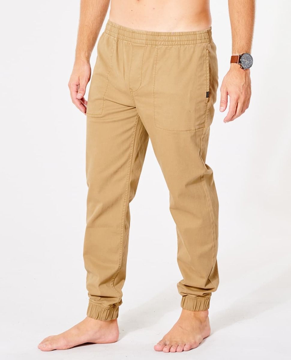 Los pantalones elásticos Epic Beach marrones para hombre tienen el sello de garantía Rip Curl en el interior.