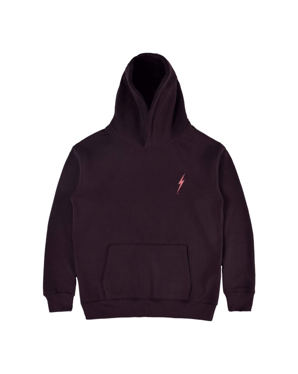 Este hoodie de ajuste regular cuenta con forro interior polar cepillado, capucha, bolsillo tipo canguro, puños y dobladillo en punto canalé, junto con el rayo de Lightning Bolt estampado en rosa en el lado izquierdo del pecho.