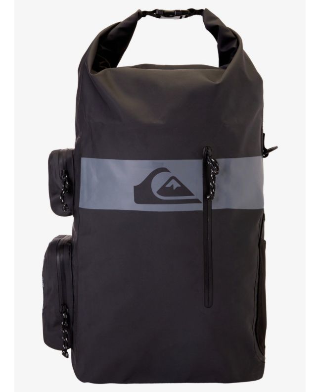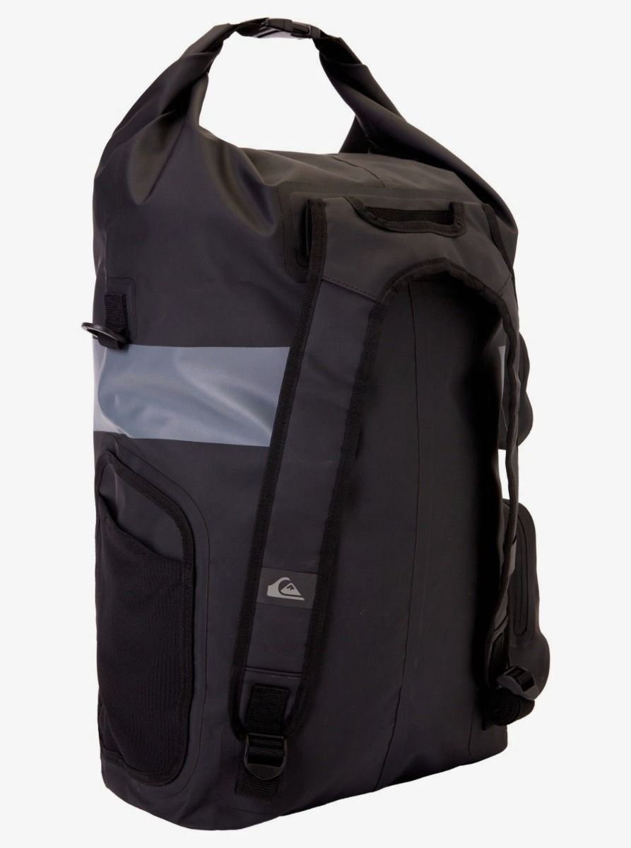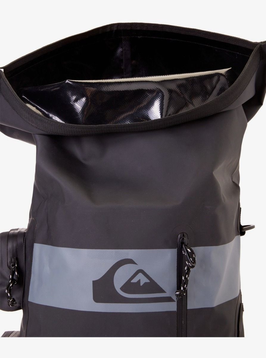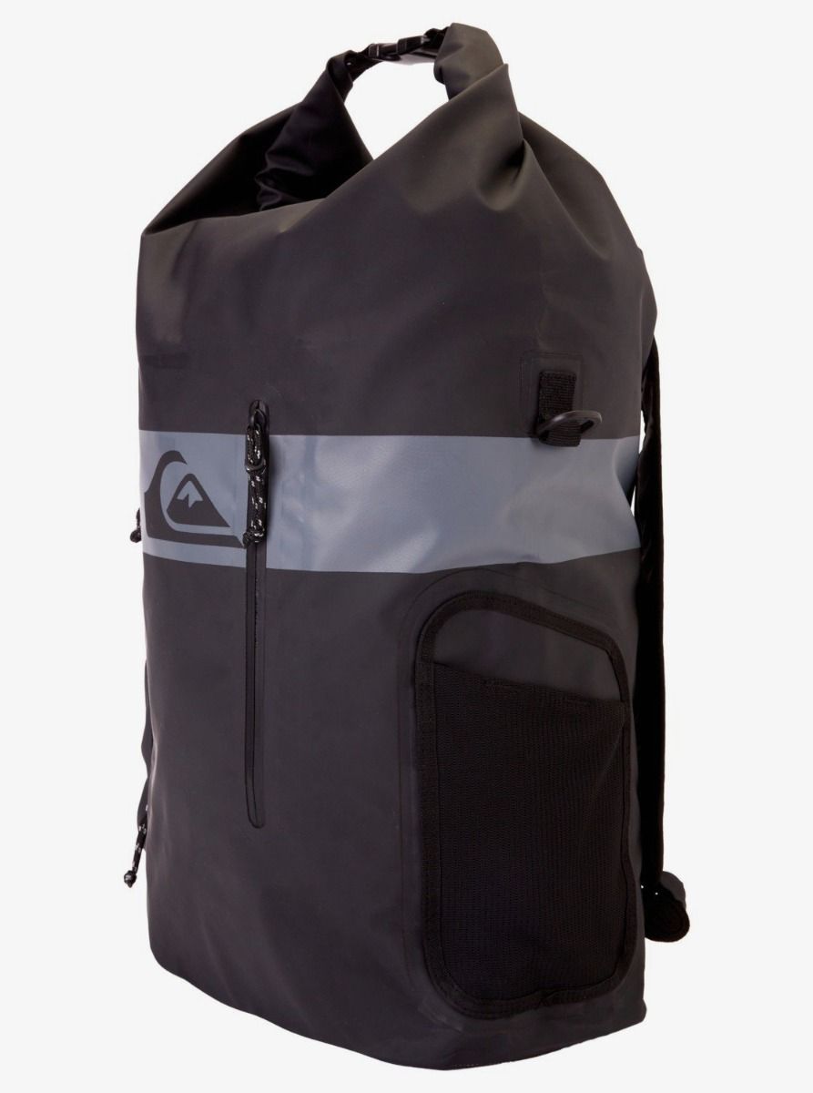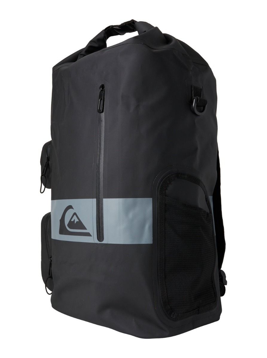 Esta práctica mochila cuenta con un amplio compartimento principal estanco reforzado para artículos mojados y secos, cierre superior enrollable, costuras reforzadas, soporte lateral para botella de agua con accesorio de anillo en D, bolsillo frontal vertical, 2 bolsillos laterales con cremallera para cera, quillas y otros accesorios, correas acolchadas ajustables para los hombros, asa superior con cierre de click y los logos de Quiksilver estampados.