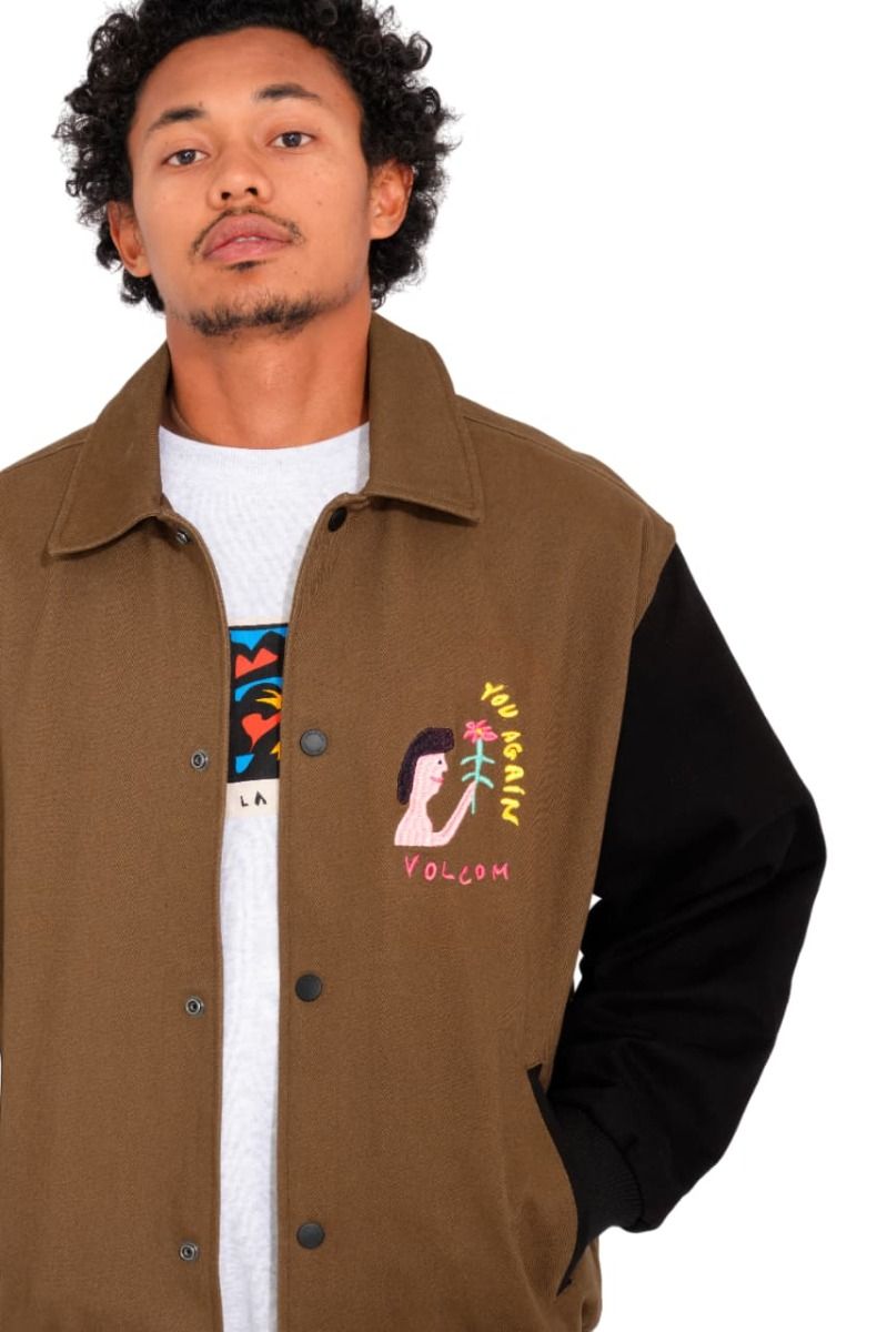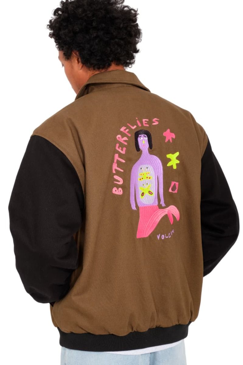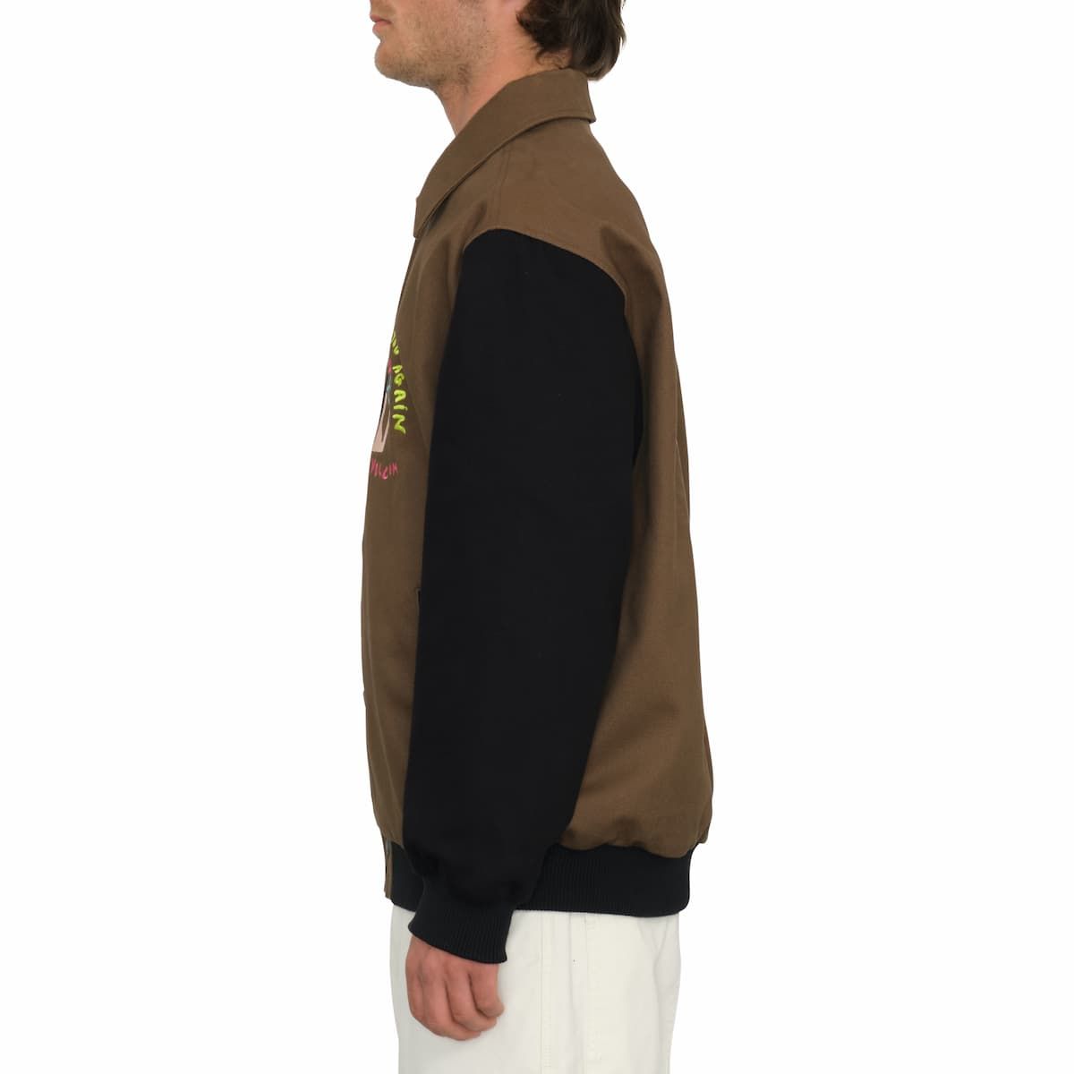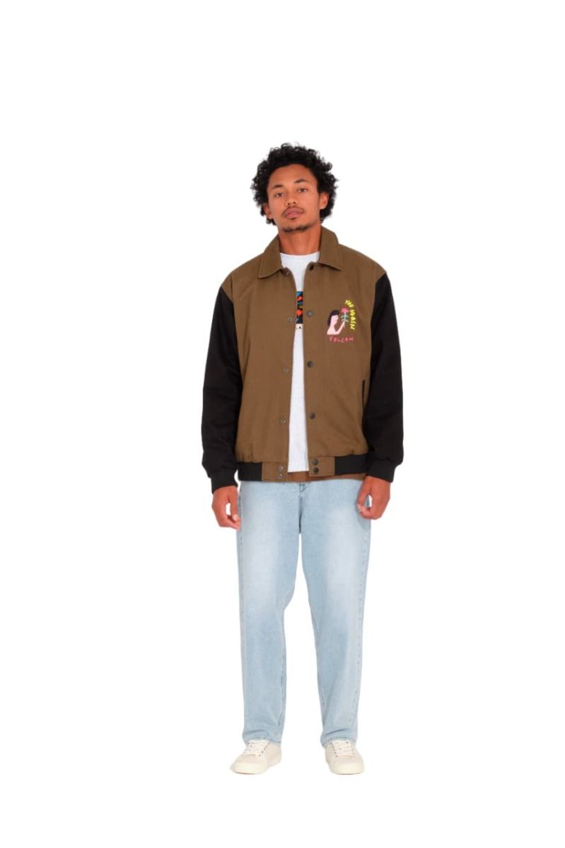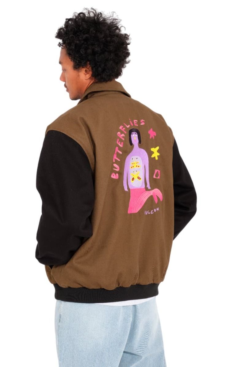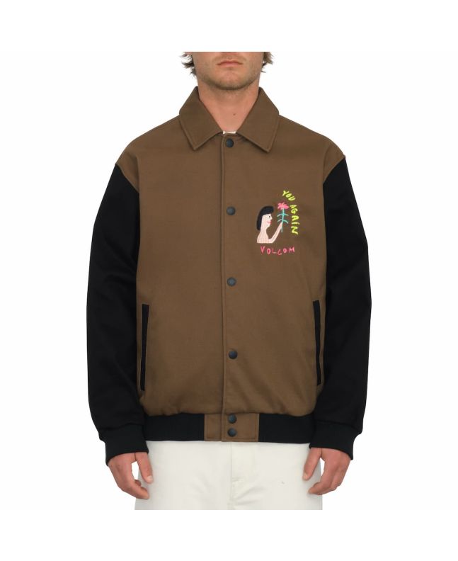 Esta cazadora clásica de estilo universitario para hombre, perteneciente a la Colección Featured Artist de Volcom, cuenta con corte cuadrado, largo hasta la cintura, puños y dobladillo inferior acanalados, cierre frontal de botones a presión, dos bolsillos laterales, un bolsillo interior y detalles bordados diseñados por el artista Arthur Longo.