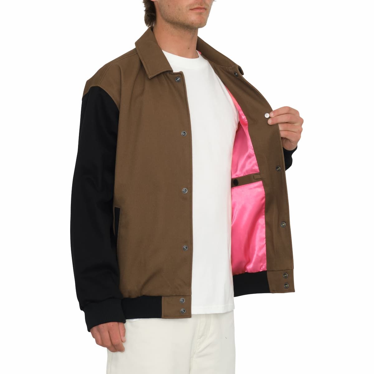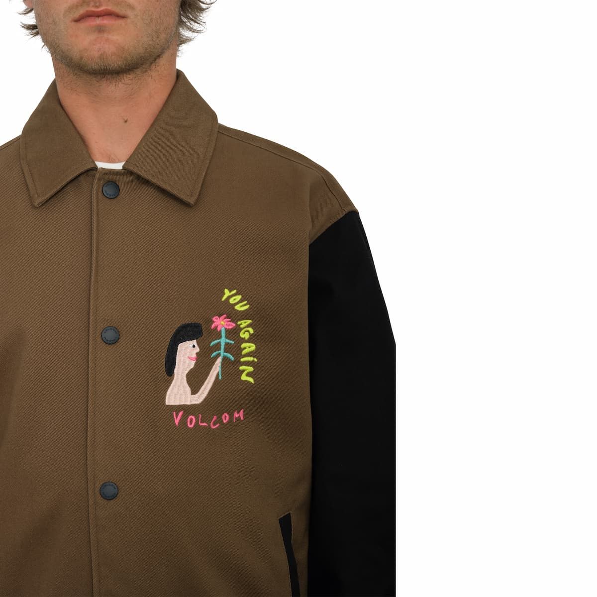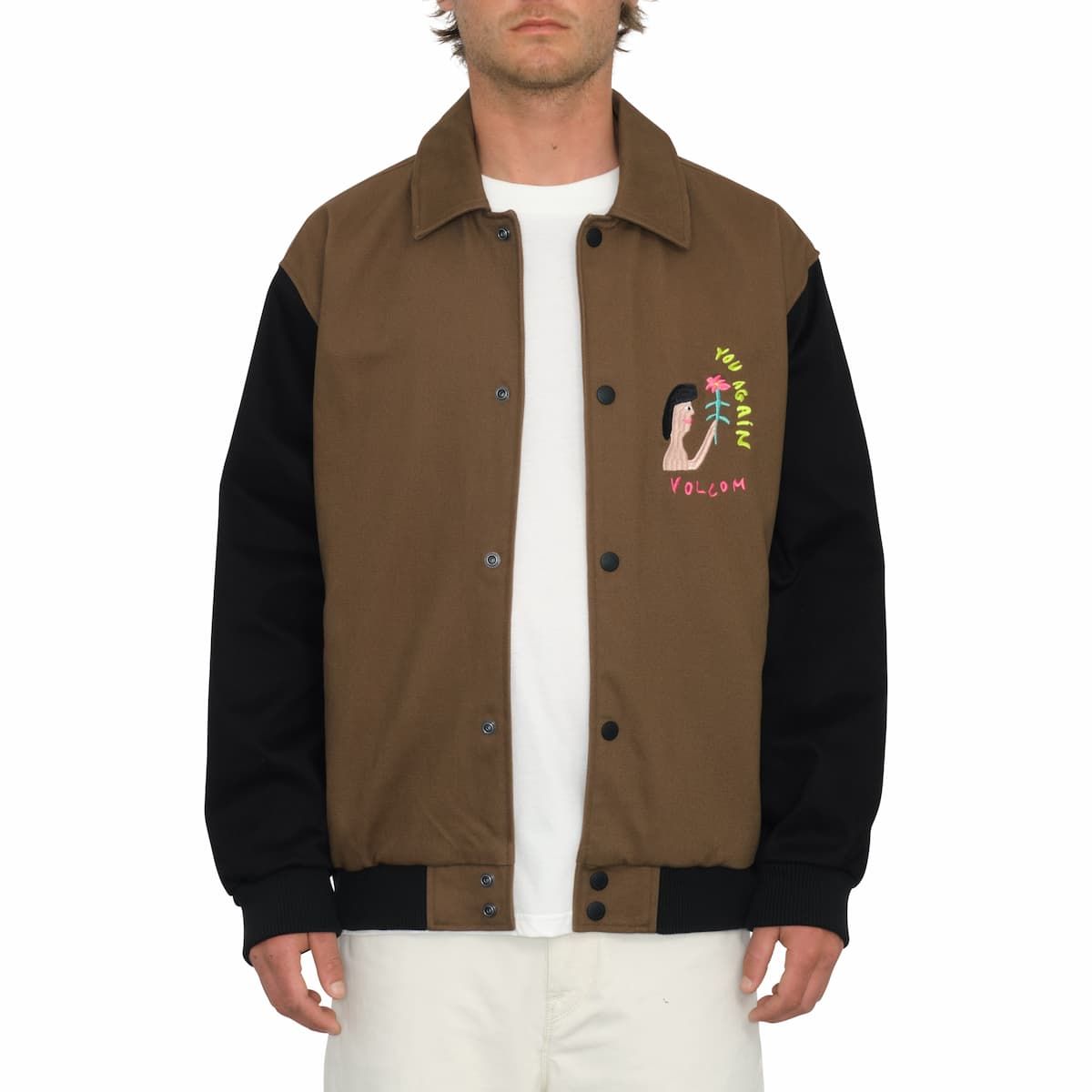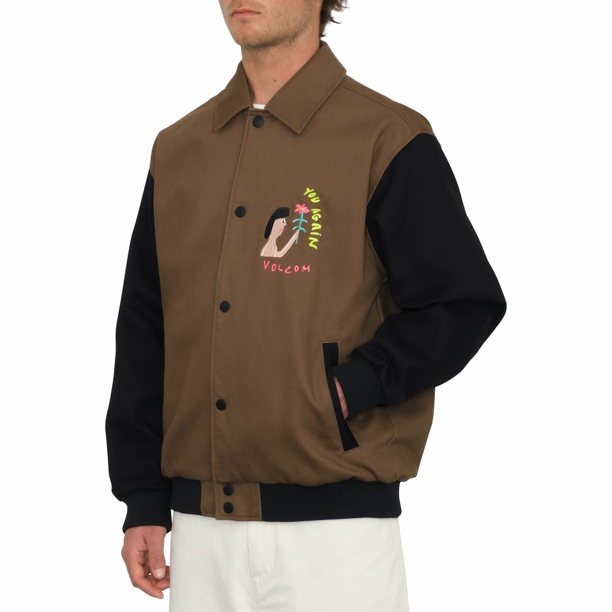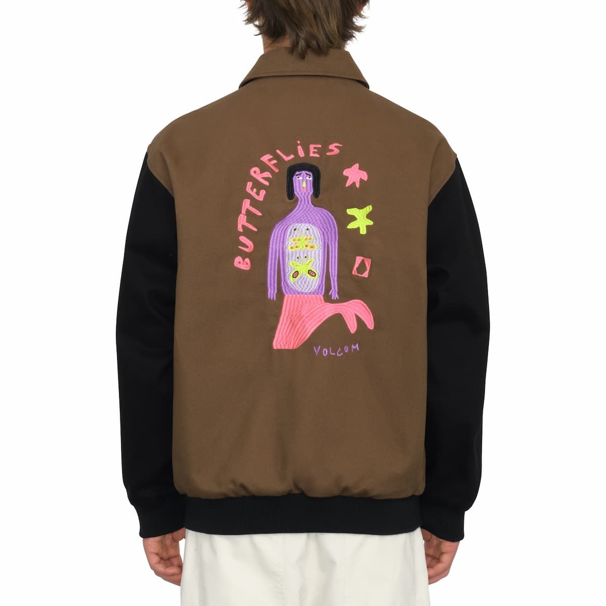 Esta cazadora clásica de estilo universitario para hombre, perteneciente a la Colección Featured Artist de Volcom, cuenta con corte cuadrado, largo hasta la cintura, puños y dobladillo inferior acanalados, cierre frontal de botones a presión, dos bolsillos laterales, un bolsillo interior y detalles bordados diseñados por el artista Arthur Longo.
