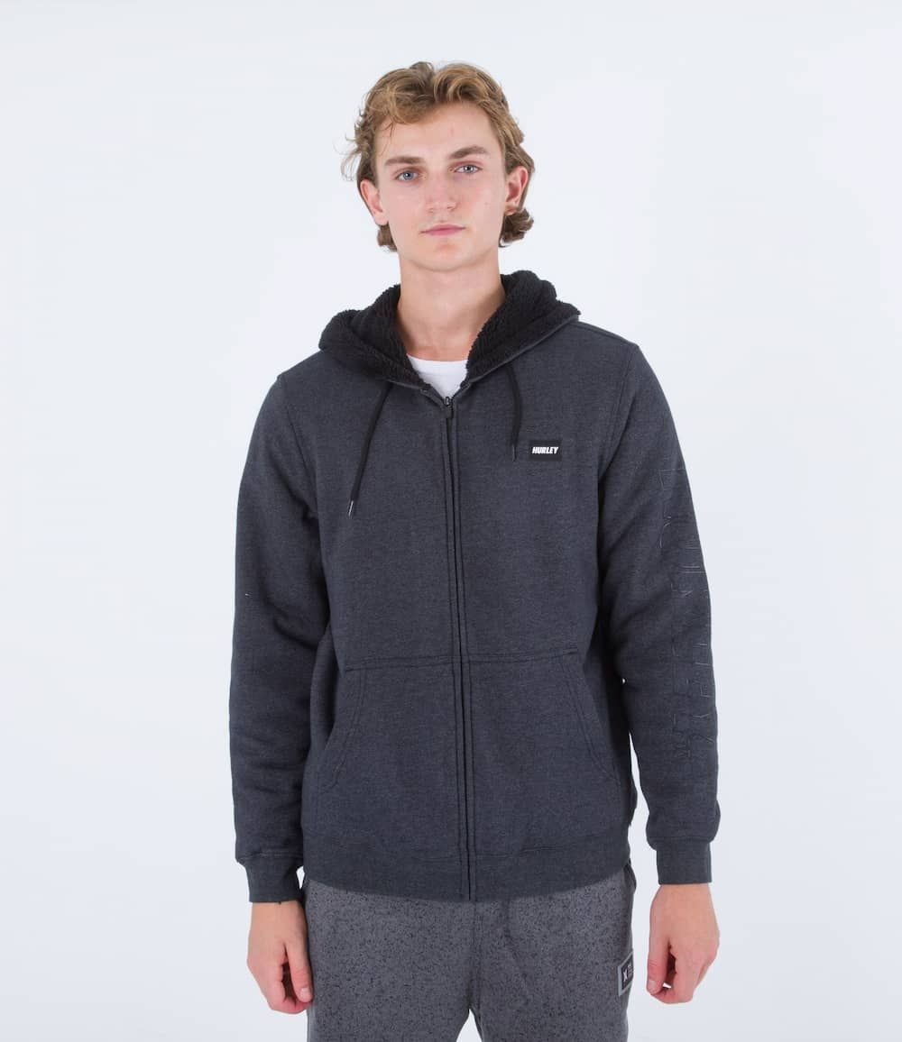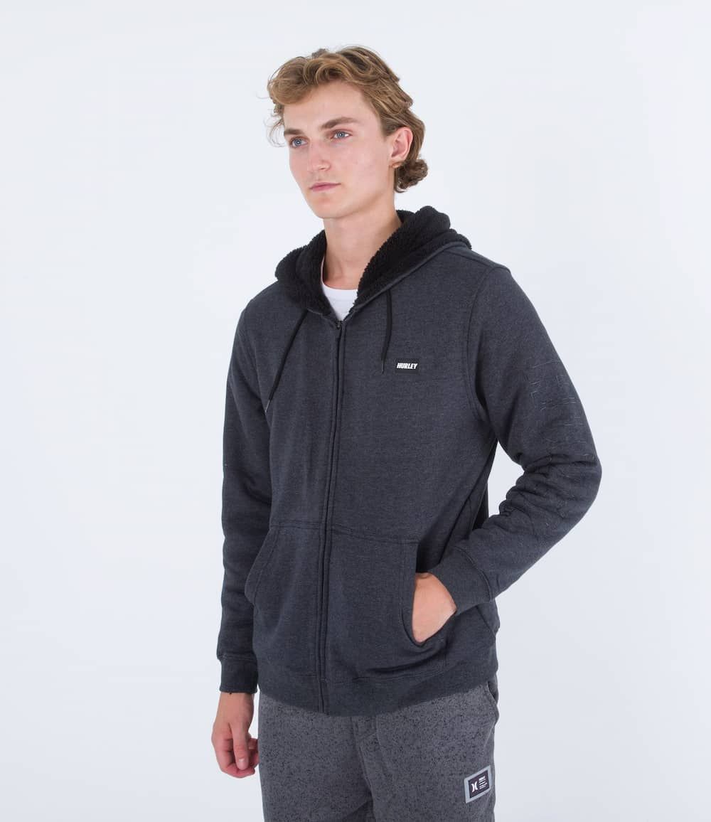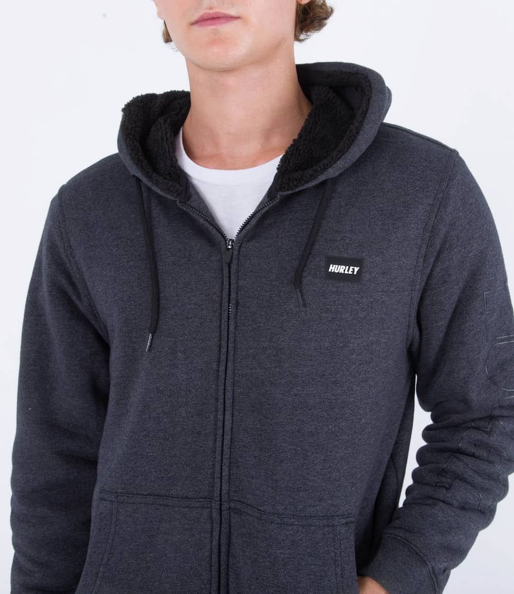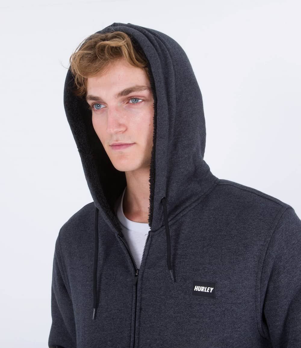 Este cálido zip hoodie cuenta con forro sherpa (240g/m2), vellón Crossdye (280g/m2), capucha ajustable mediante cordón, cierre frontal de cremallera, bolsillo delantero tipo canguro, logo de Hurley en Fastlane estampado en la manga izquierda y un parche Fastlane de goma con el logo de la marca en el lado izquierdo del pecho.