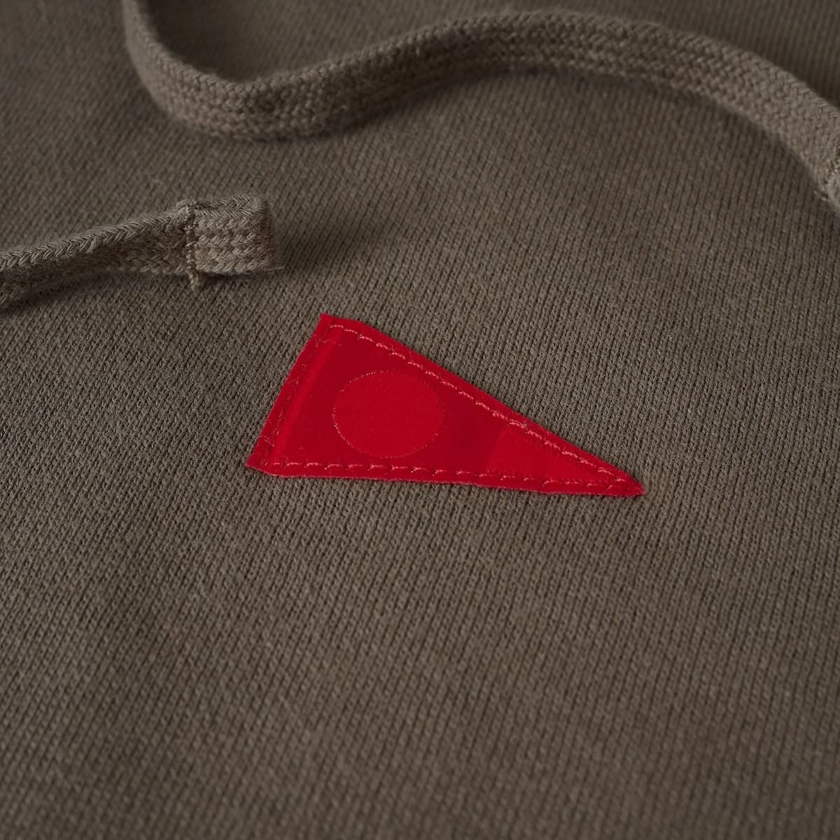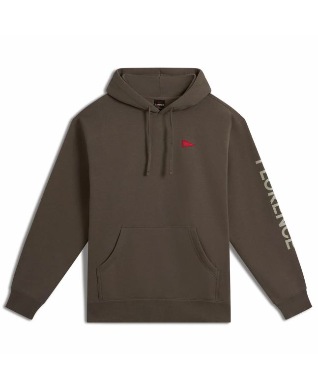 Sudadera con capucha Florence Marine X Burgee en marrón (Pumice). Corte estándar, interior cálido, bandera bordada y logo en la manga.