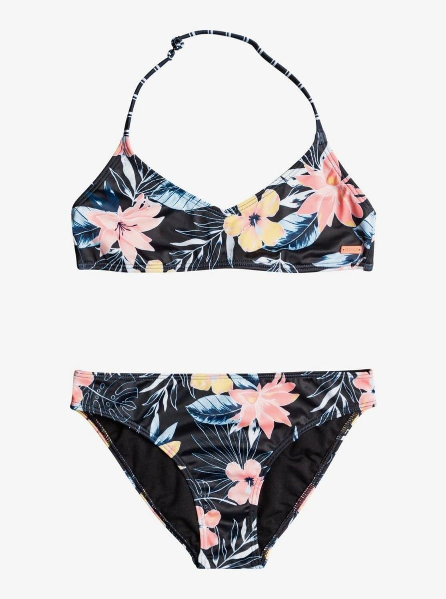 El bikini bralette para chicas entre 8 y 16 años Flowers Addict en color negro con estampado floral (Anthracite S Rg Tropical Breez) de Roxy está compuesto por top y una braguita de bikini confeccionados con tejido reciclado, elástico, suave y resistente al cloro (82% poliéster reciclado, 18% elastano).