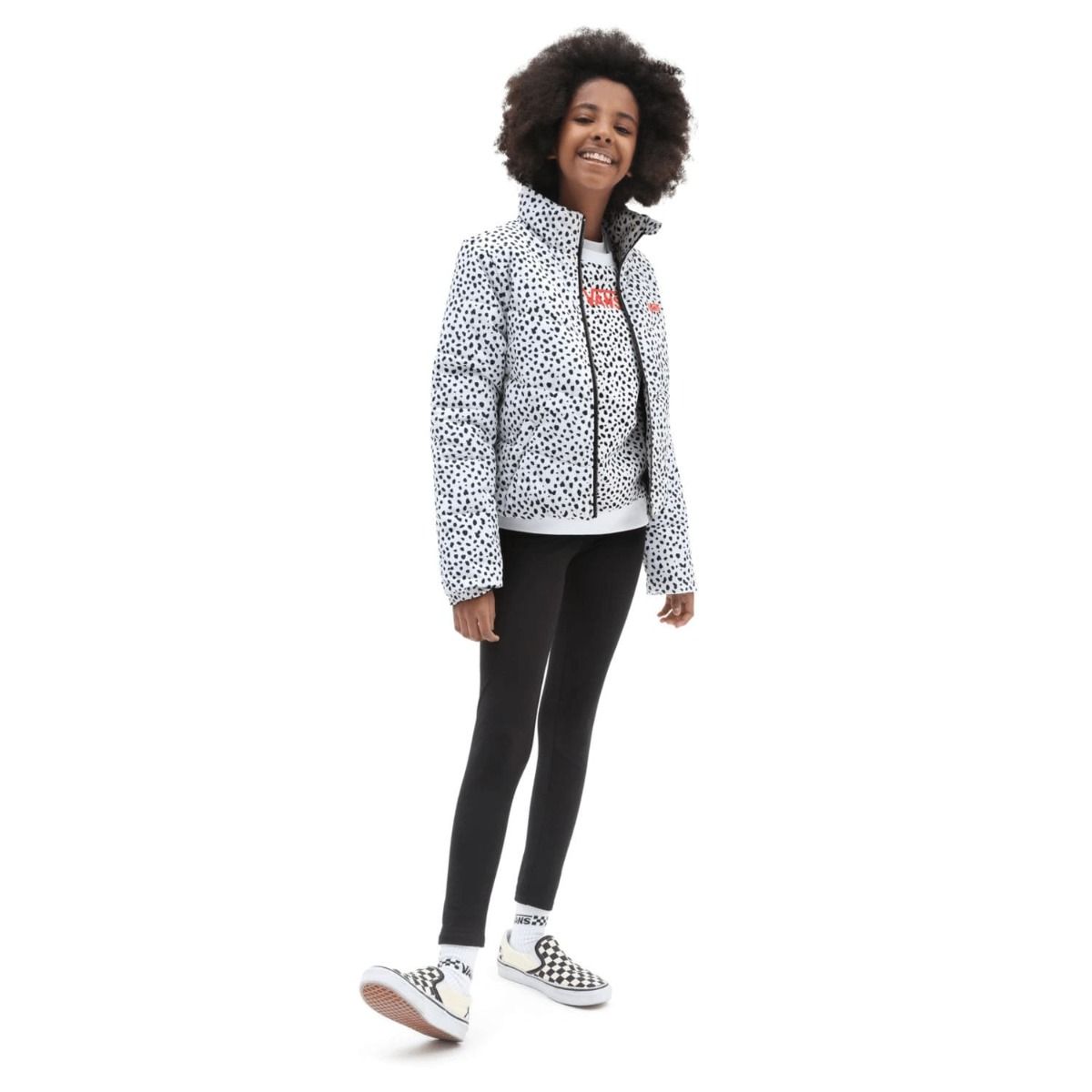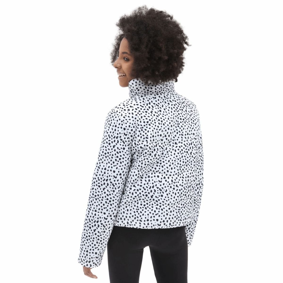 La chaqueta acolchada para niñas de entre 8 y 14 años Foundry MTE-1 Print blanca con manchas negras (Black-White) de Vans está confeccionada con 100% poliéster con revestimiento hidrófugo duradero (DWR).