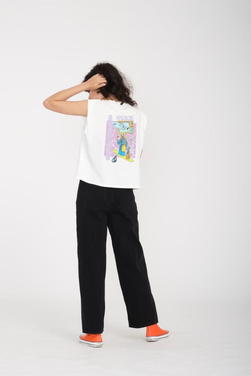 Este Tank Top veraniego de corte boxy cuenta con cuello redondo y un estampado gráfico de la Colección Asphalt Beach de Volcom impreso en el lado izquierdo del pecho y en la espalda.