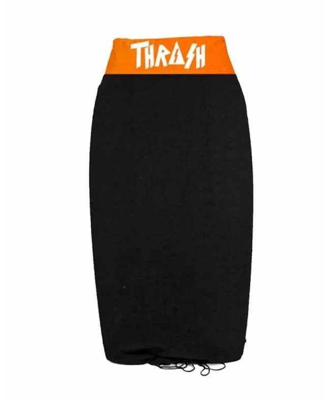 La funda de toalla para tablas de body Thrash negra y naranja cuenta con un refuerzo en la punta, un bolsillo interior con cierre de velcro y cierre ajustable con cordón.