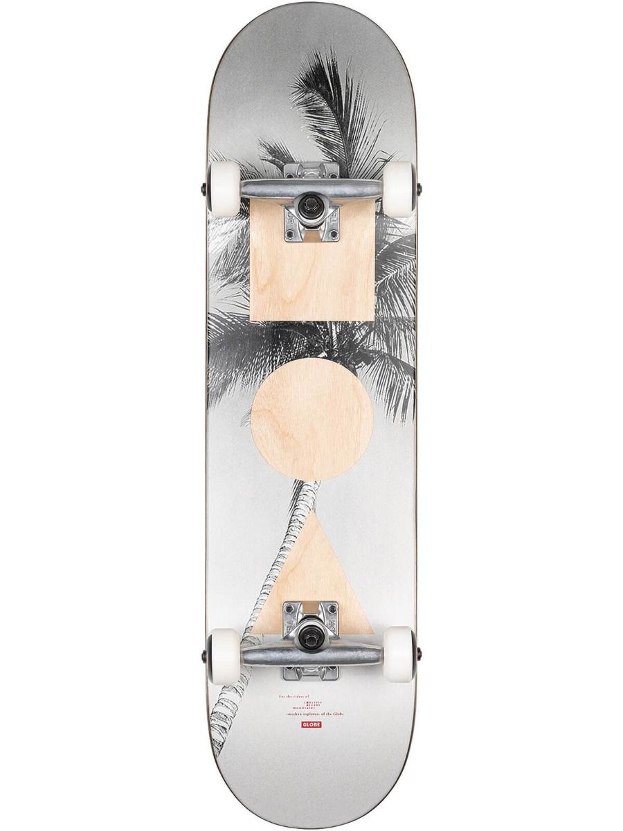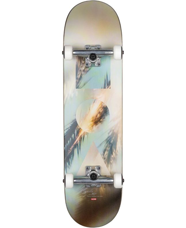 El skate completo Globe G1 Stack está disponible en beige (Terrain) con tabla de 8.125", en gris con palmeras (Lone Palm) con tabla de 8.0", en beige estampado de palmeras (Daydream) con tabla de 8.255", y en negro con nubes (Black/Candy Clouds) con tabla de 8.375".