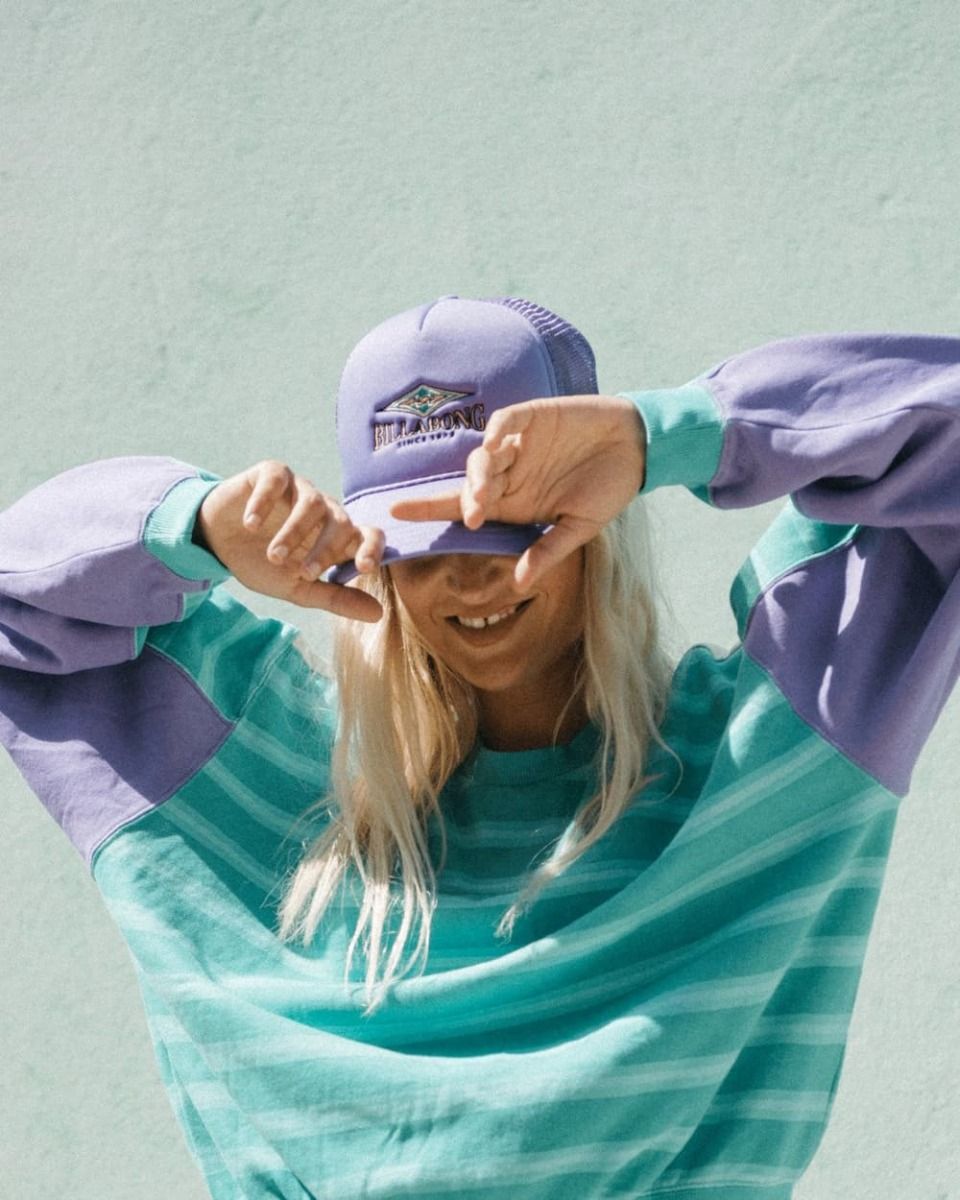 Gorra trucker Billabong Grandpa morada para mujer, ligera, transpirable y ajustable.