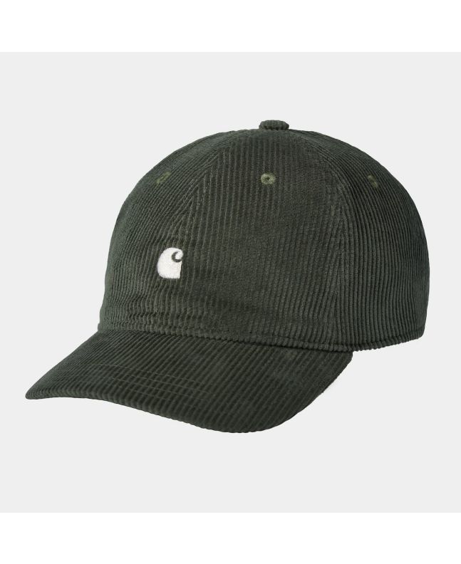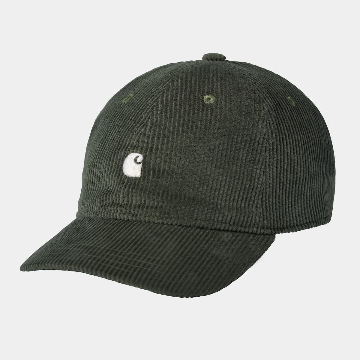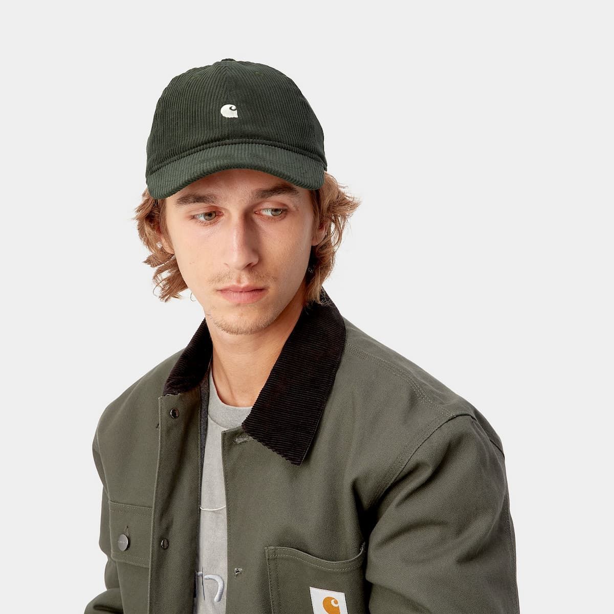 La gorra para hombre y mujer Harlem Cap en color verde con el logo de Carhartt en blanco (Boxwood/Wax) está confeccionada con 100% pana de algodón de 8 wales.